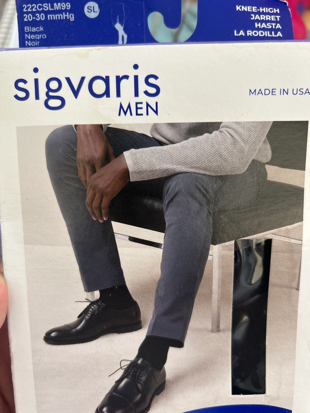 Large Sigvaris men's knee-high compression socks. Black colour. 20-30 mmHg compression. Made in the USA.
