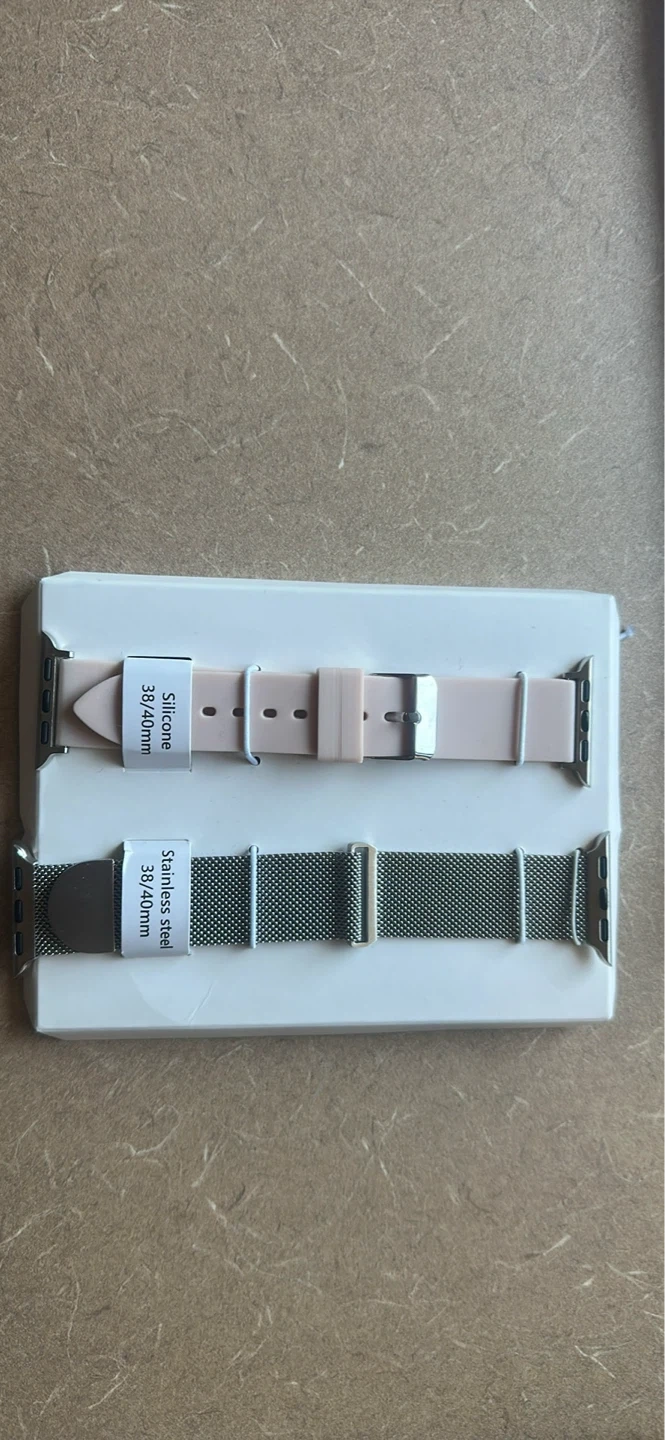 Comes with a pink silicone band and a stainless steel mesh band. Both are compatible with 38/40mm Apple Watch models. They're perfect for switching up your watch's look!