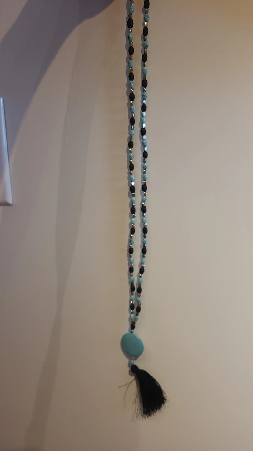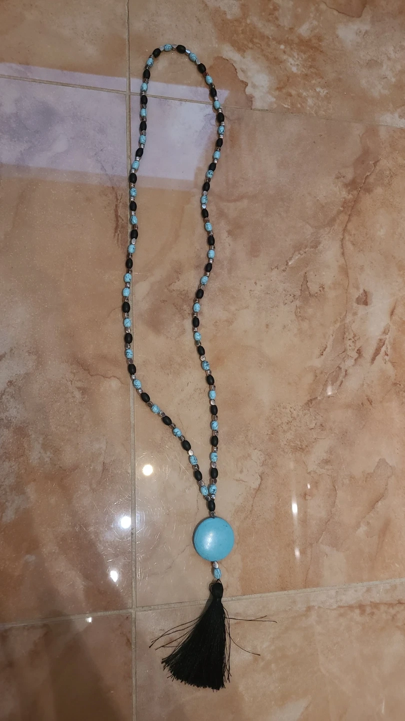 This necklace features a long strand of small black and blue-green beads, accented with silver-toned beads. It has a large, smooth, light blue pendant with a black tassel. It's a unique statement piece that can add flair to any outfit!