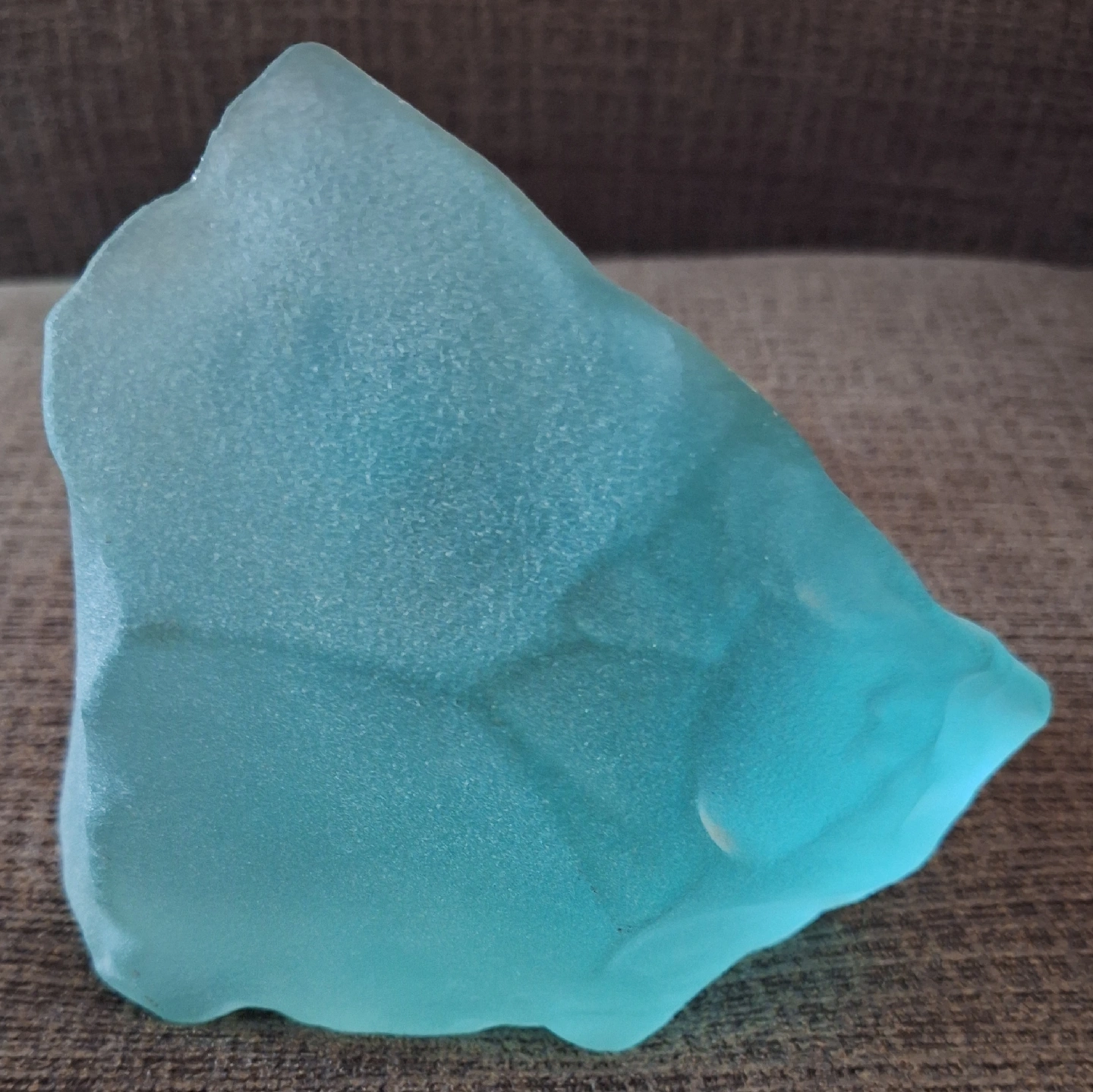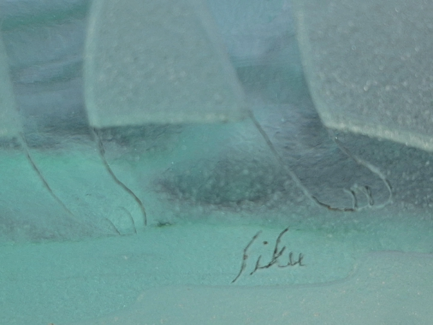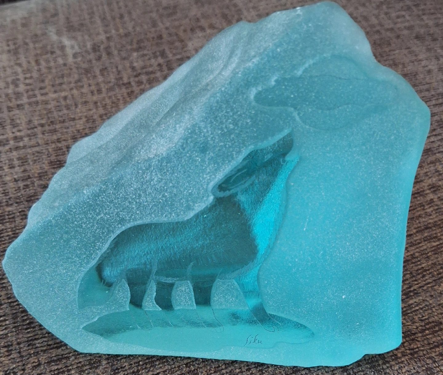 Beautiful blue frosted glass sculpture featuring a wolf howling at the moon. It's signed 'siku' at the bottom. large size 6 inches x 5.5 tall x 3 inches thick