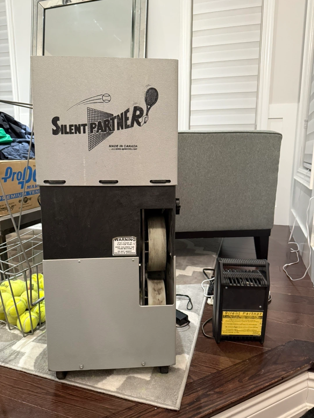 55Silent Partner Ultra Lite Tennis Ball Machine with portable AC inverter option. Bought a while ago but well maintained, works very well. Mostly used indoors with the external AC Inverter attachment, so battery life is perfect. I’ve used it outside on the courts as well at times, usually for 2 hours, no issues, still 50-75% charge left when I’m done. With the AC inverter, you can play for unlimited time. The external/plug in inverter alone was about $260. Selling because upgrading but this machine served me very well and is great for honing your tennis skills. Asking $600 OBO for the machine and inverter together. Can consider delivering if located within a reasonable distance from me.