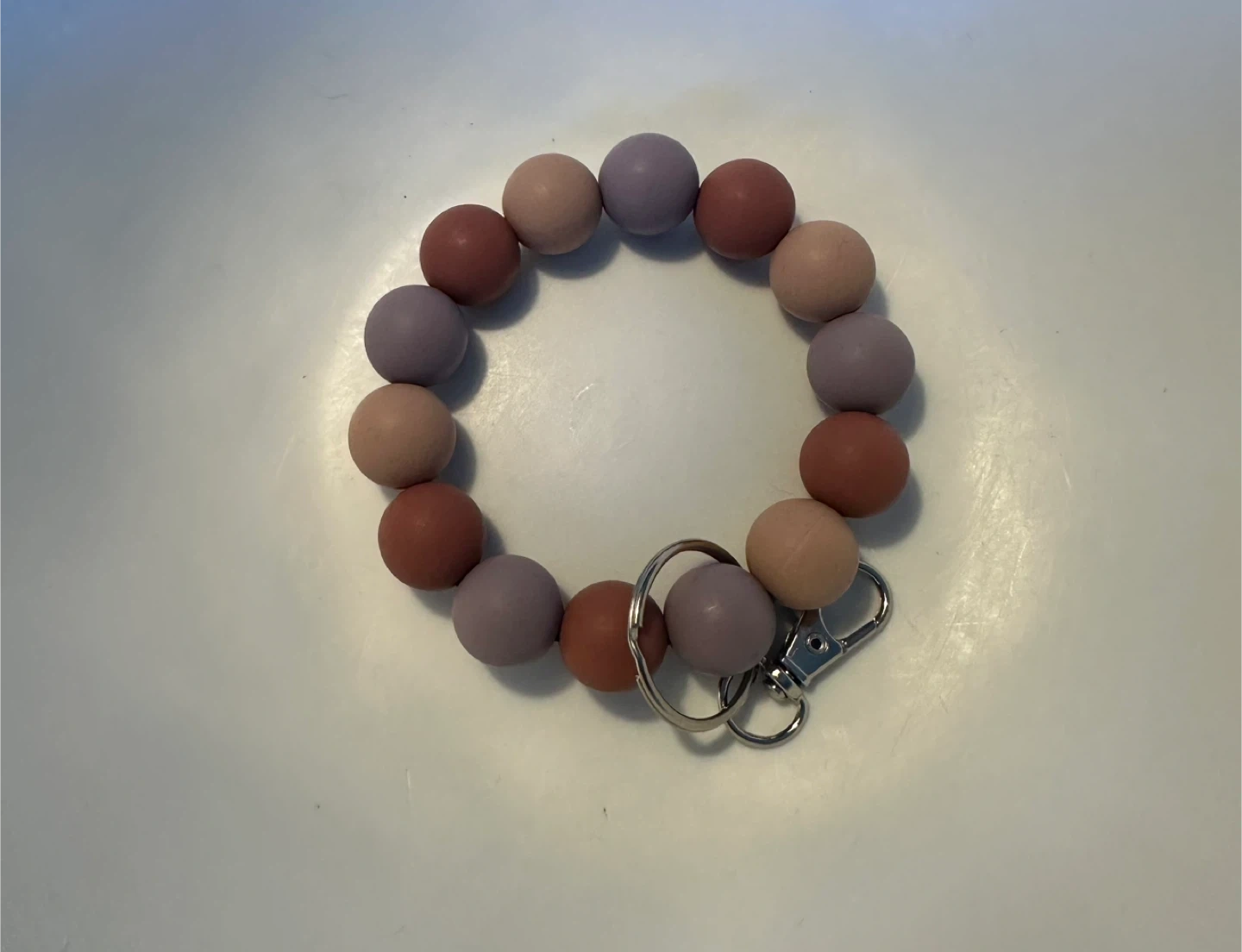 75Cute beaded bracelet keychain in a mix of lilac, beige, and brown tones. It's perfect for keeping your keys handy and adding a little style to your everyday carry. The beads are smooth and comfortable to wear, and the clasp is sturdy