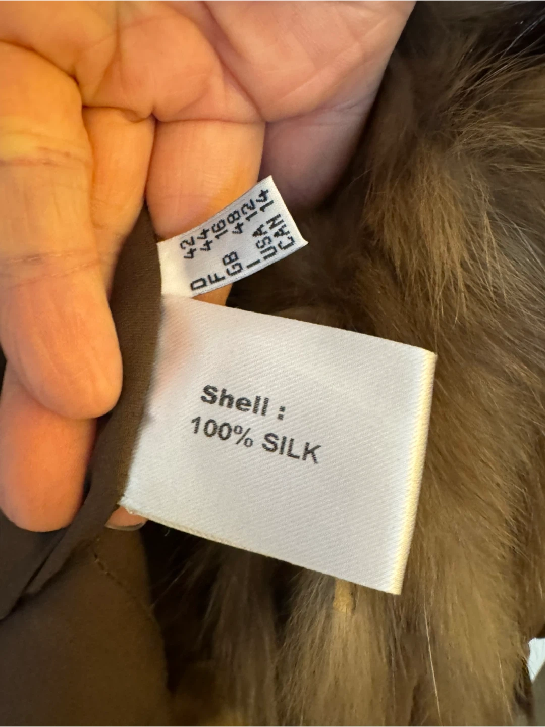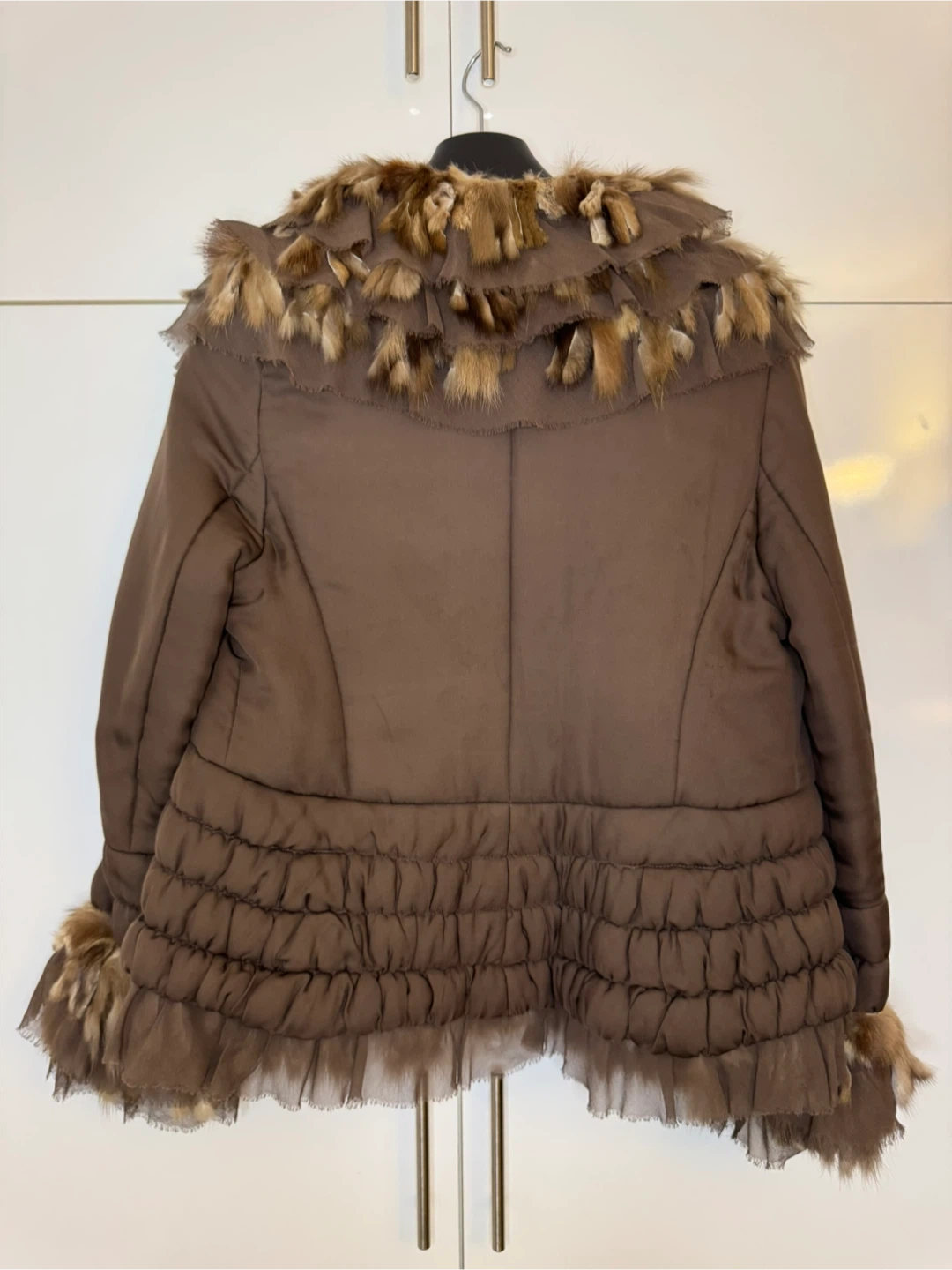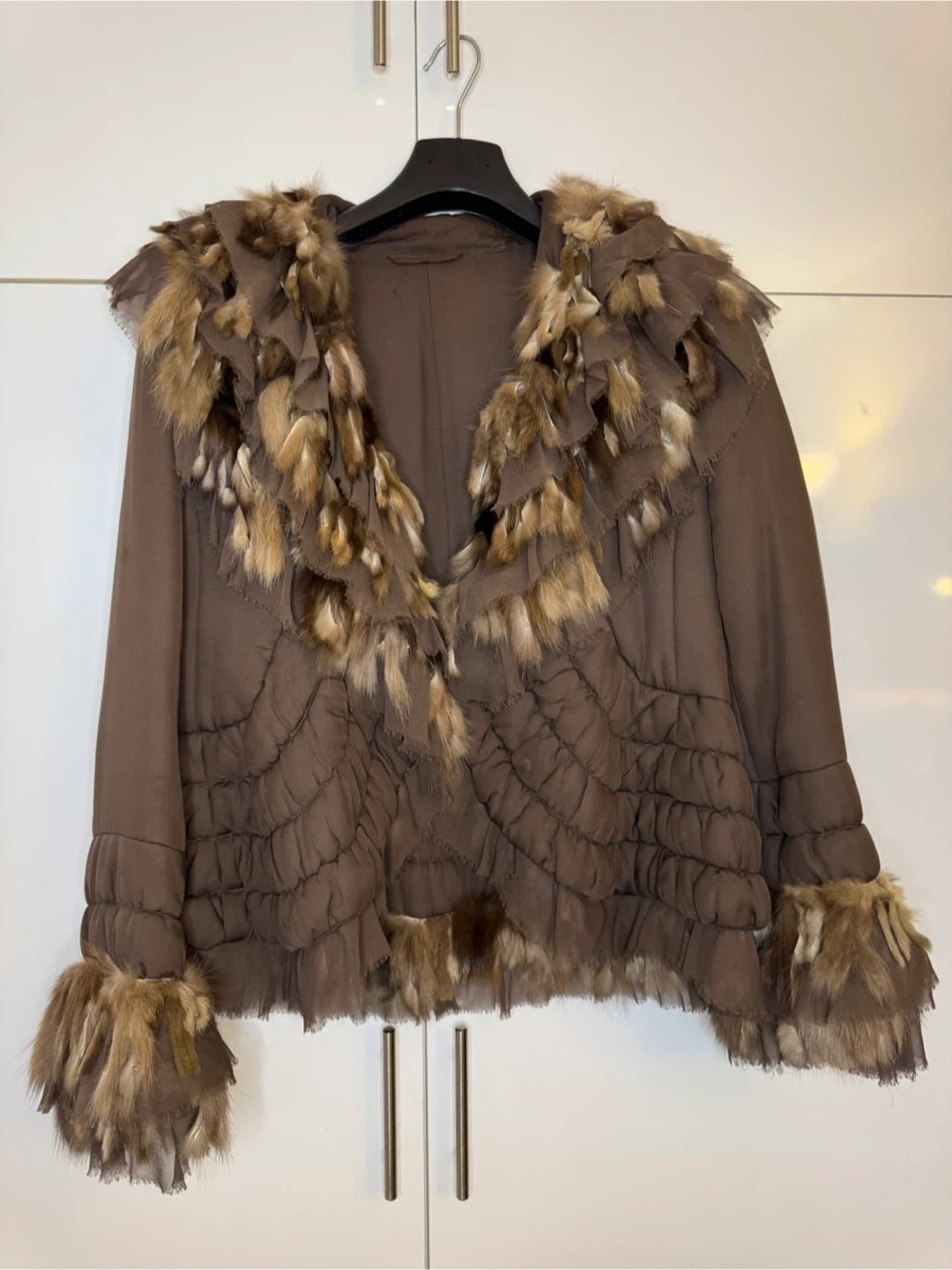155Stylish jacket with fur trim detailing. The shell is made of 100% silk, giving it a luxurious feel. Perfect for adding a touch of elegance to any outfit while keeping you warm this fall.