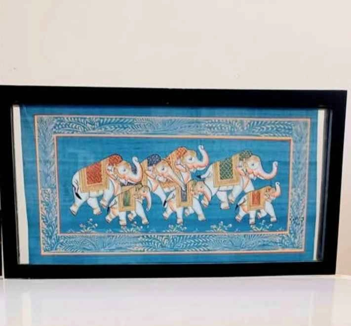 65Vintage, Rare, Glass Framed, Indian Hand-painted Artwork depicting a Parade of Regal Elephants. Symbolize Good Luck, Royalty, and Wisdom in Indian Culture. Painted on Silk , with a Decorative Border. The painting Style is Traditional, with detailed work and Rich Colors. Size : 42.50 * 22.50 cm Very Good Condition Please check out my other rare collectibles!