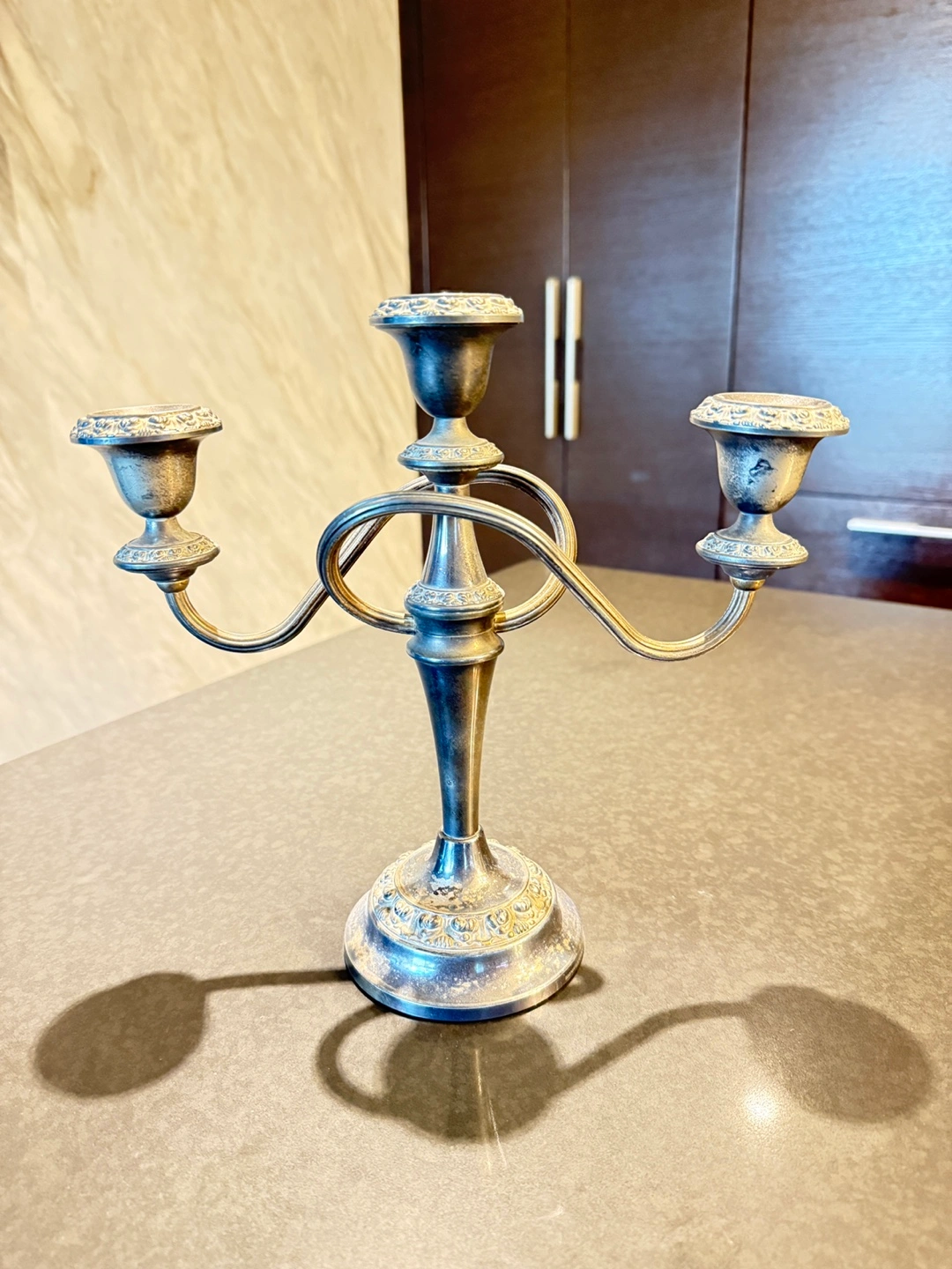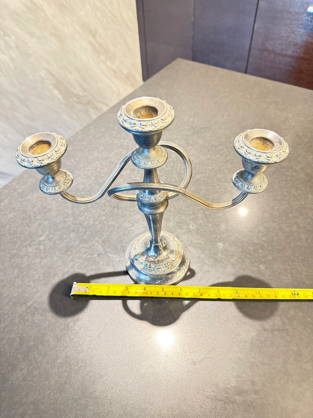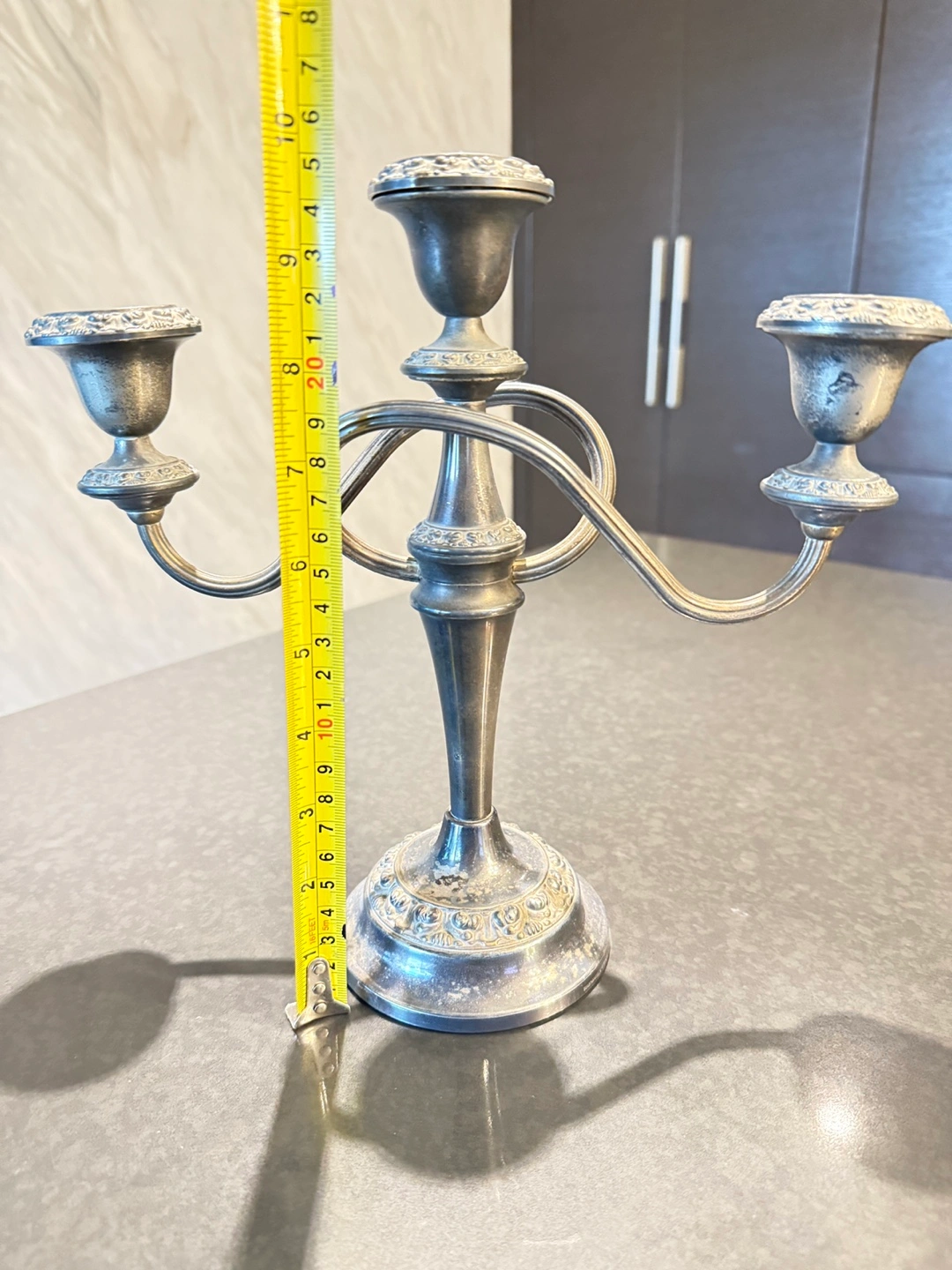 481Selling a silver candelabra that holds three candles. It shows some signs of use, but it's in good condition overall. It measures approximately 8 inches in height.