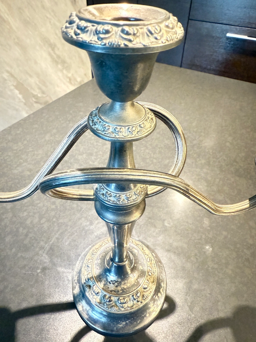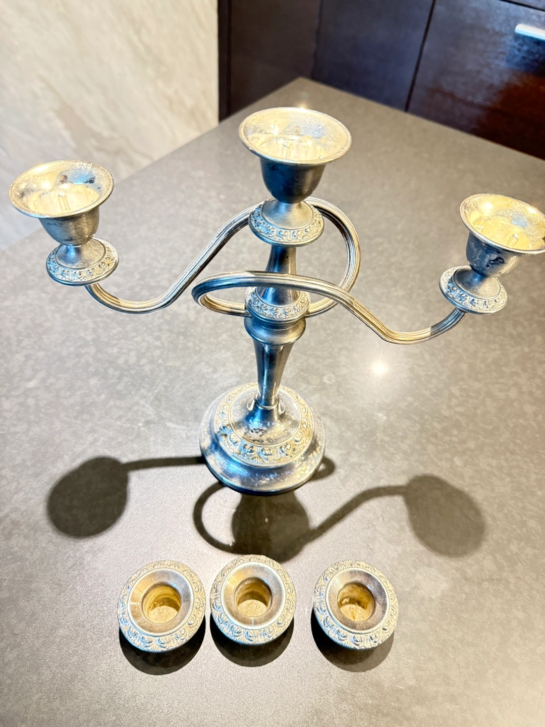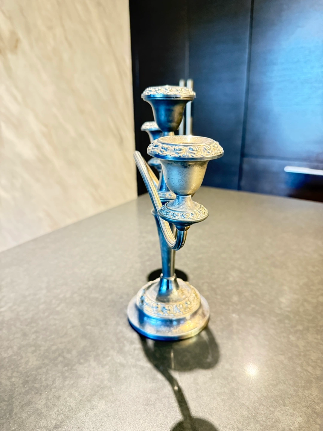 481Selling a silver candelabra that holds three candles. It shows some signs of use, but it's in good condition overall. It measures approximately 8 inches in height.