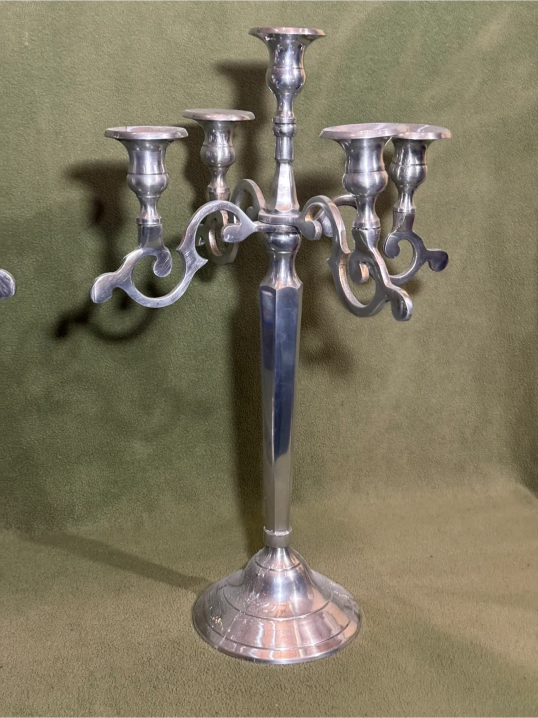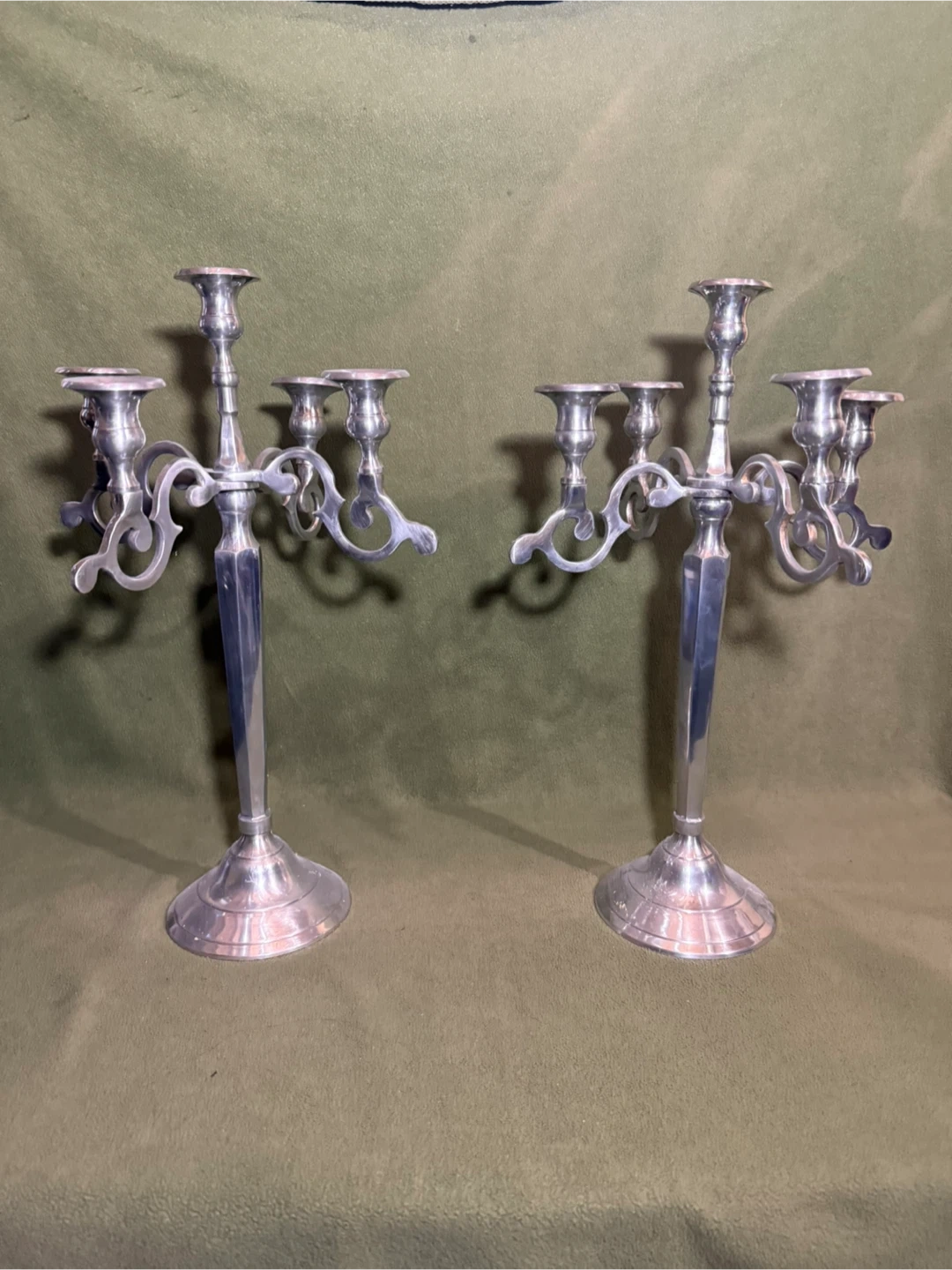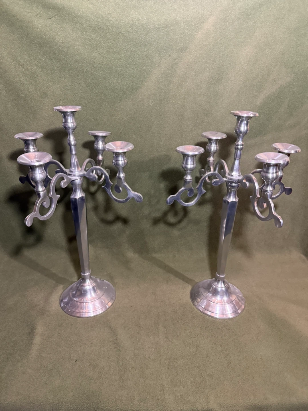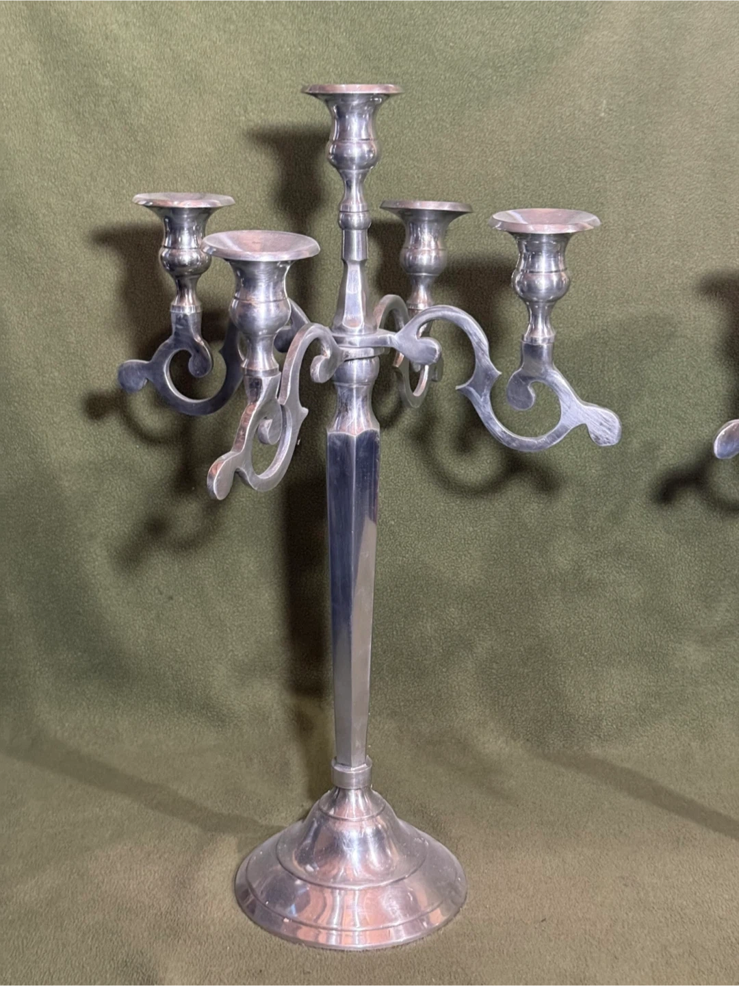 Add a touch of elegance to your home with these used, ornate silver 5-candle holders. Perfect for creating a warm and inviting atmosphere, this pair is in good condition and ready to adorn your dining table or mantelpiece. Note that they have signs of use, but are still very beautiful. And will clean up nice I give them a wipe to get them shinning Asking $85 for the pair Looking to add a bit of sparkle to your home? These candle holders are ready to be whisked away to their new home! But don't wait too long, because if the ad is still up, they're still available!