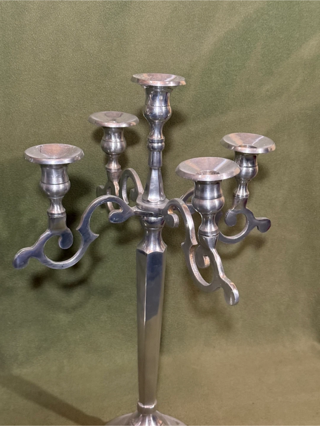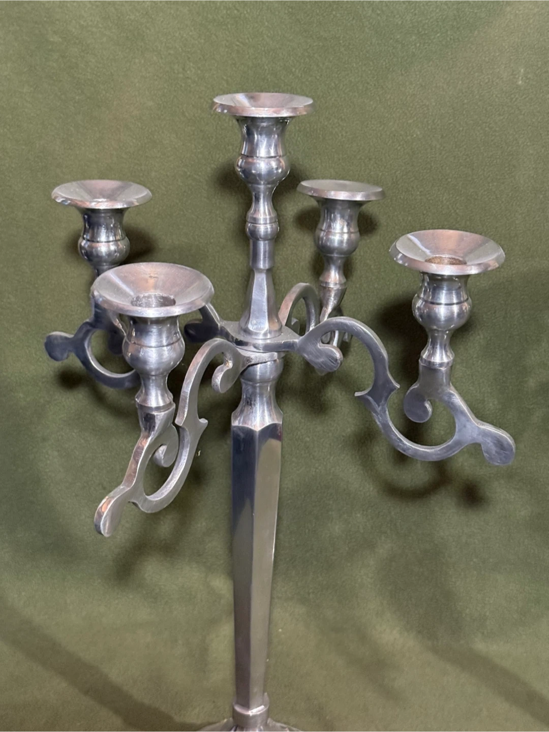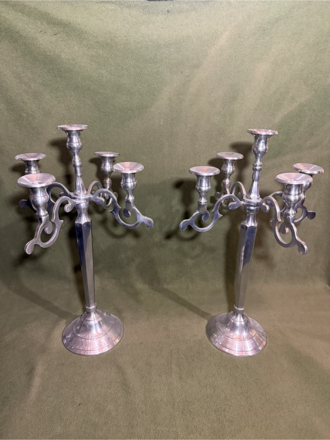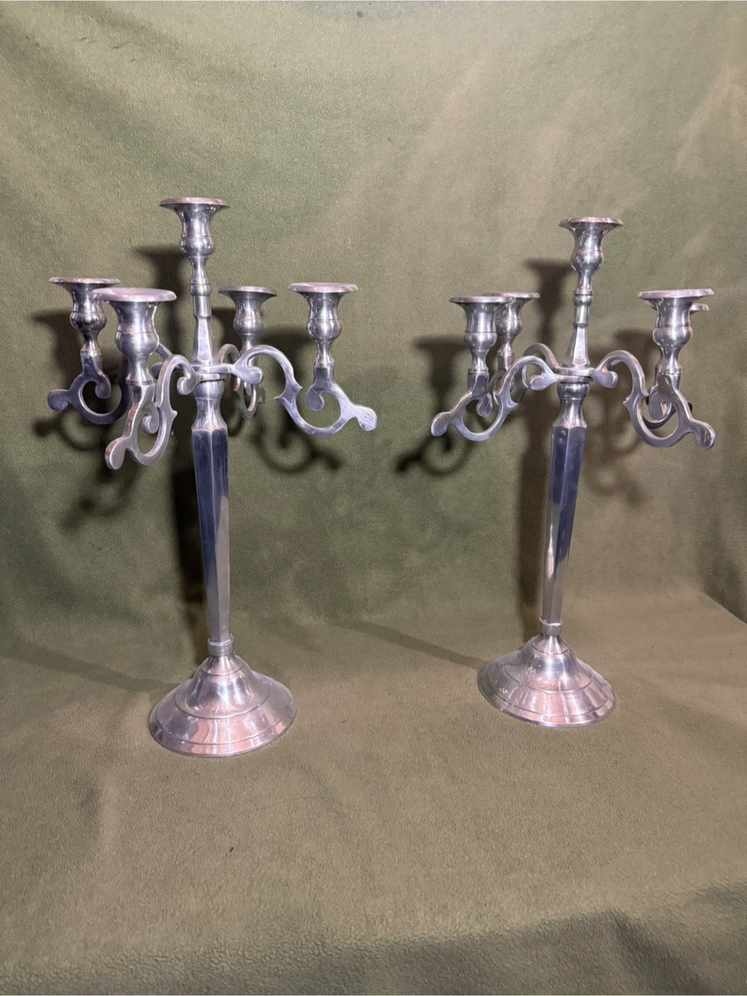Add a touch of elegance to your home with these used, ornate silver 5-candle holders. Perfect for creating a warm and inviting atmosphere, this pair is in good condition and ready to adorn your dining table or mantelpiece. Note that they have signs of use, but are still very beautiful. And will clean up nice I give them a wipe to get them shinning Asking $85 for the pair Looking to add a bit of sparkle to your home? These candle holders are ready to be whisked away to their new home! But don't wait too long, because if the ad is still up, they're still available!