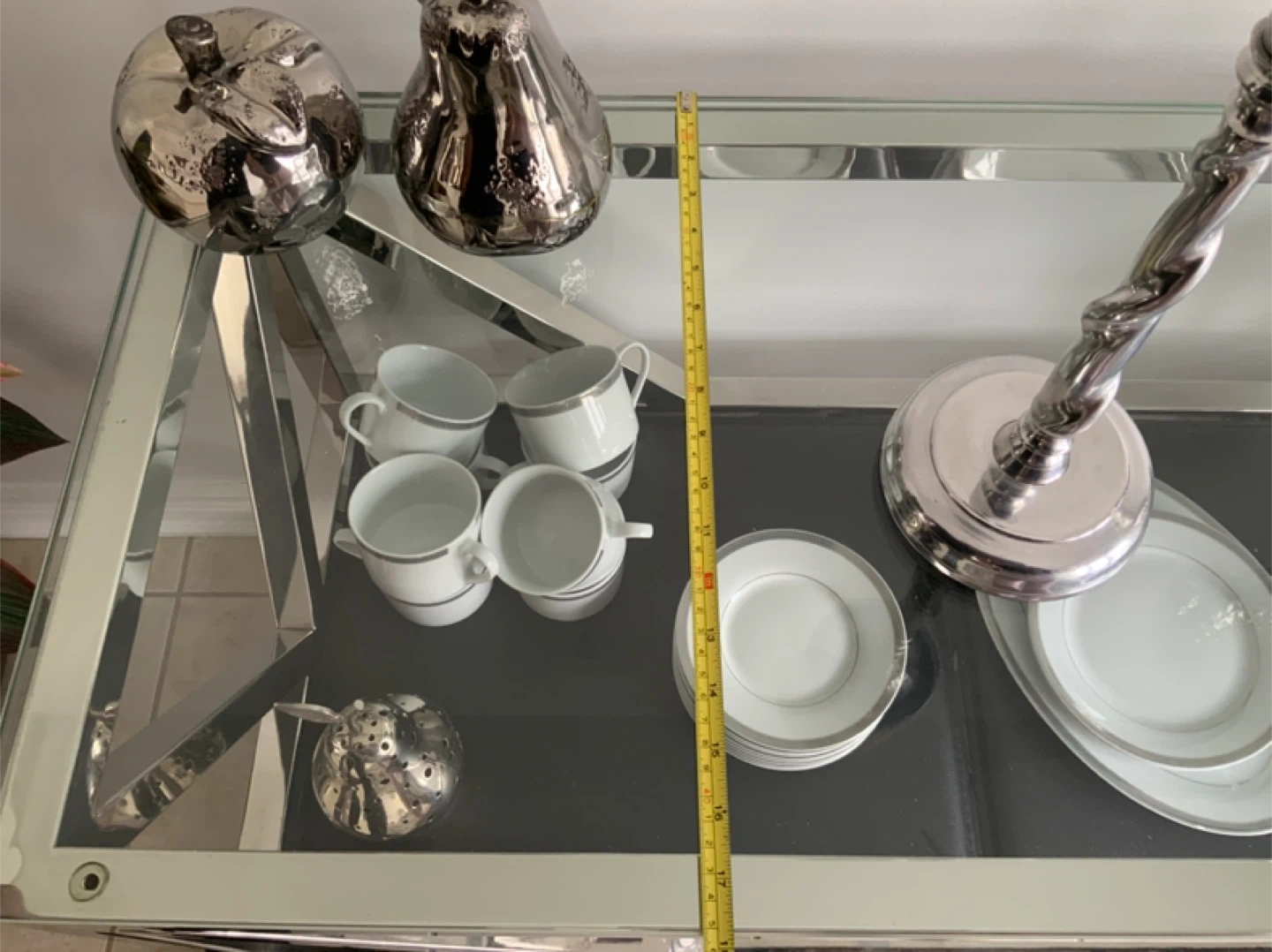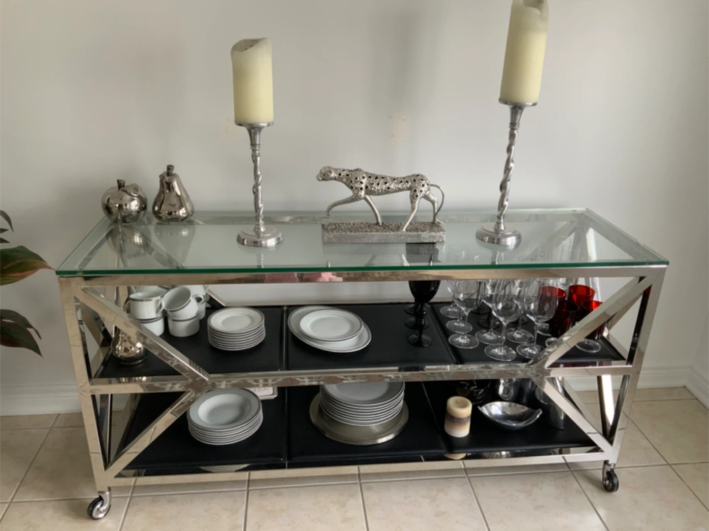 Selling a stylish silver bar cart with a glass top! It's perfect for entertaining and adding a touch of elegance to your space. The cart features multiple tiers for storage and display, and it's on wheels for easy movement. Great for holding glassware, drinks, and other bar essentials. Small chip in glass top seen in photo.