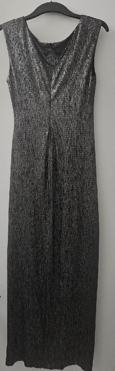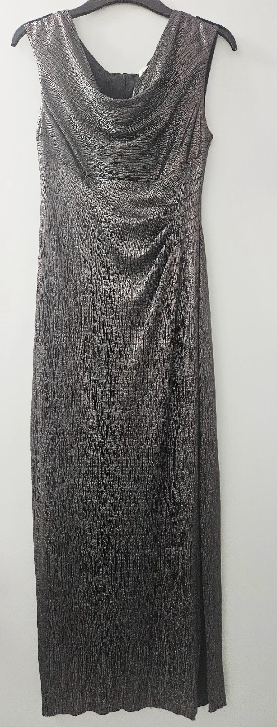 Selling a formal, silver, iridescent dress with a grecian neckline. It has a unique textured pattern that gives it a shimmering effect. Perfect for a night out or a special occasion!
