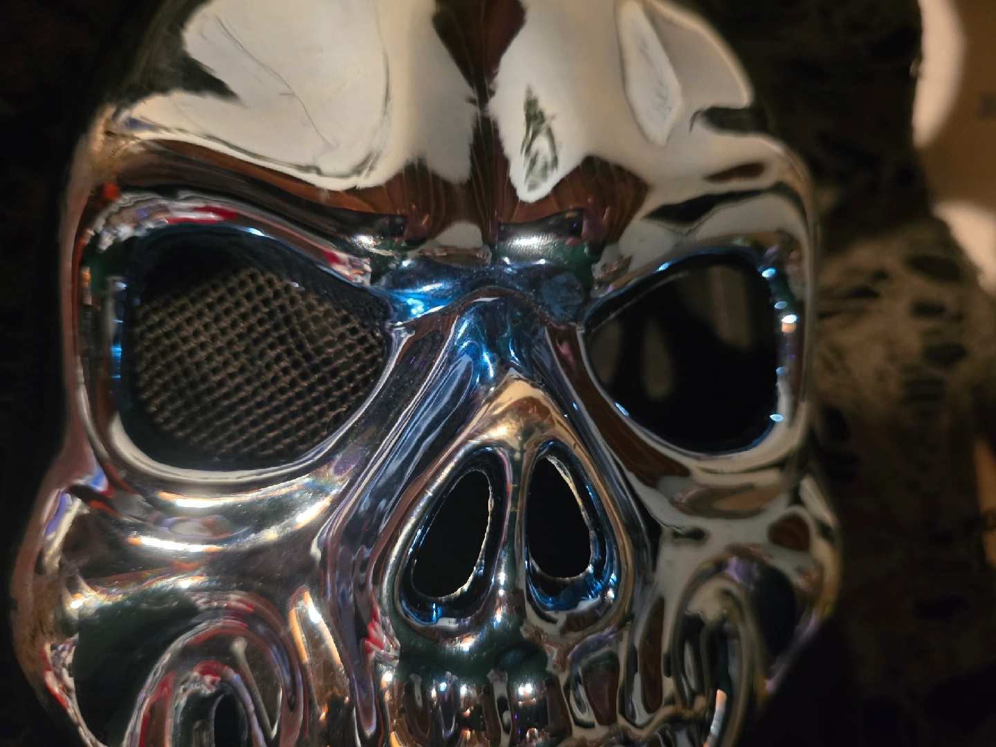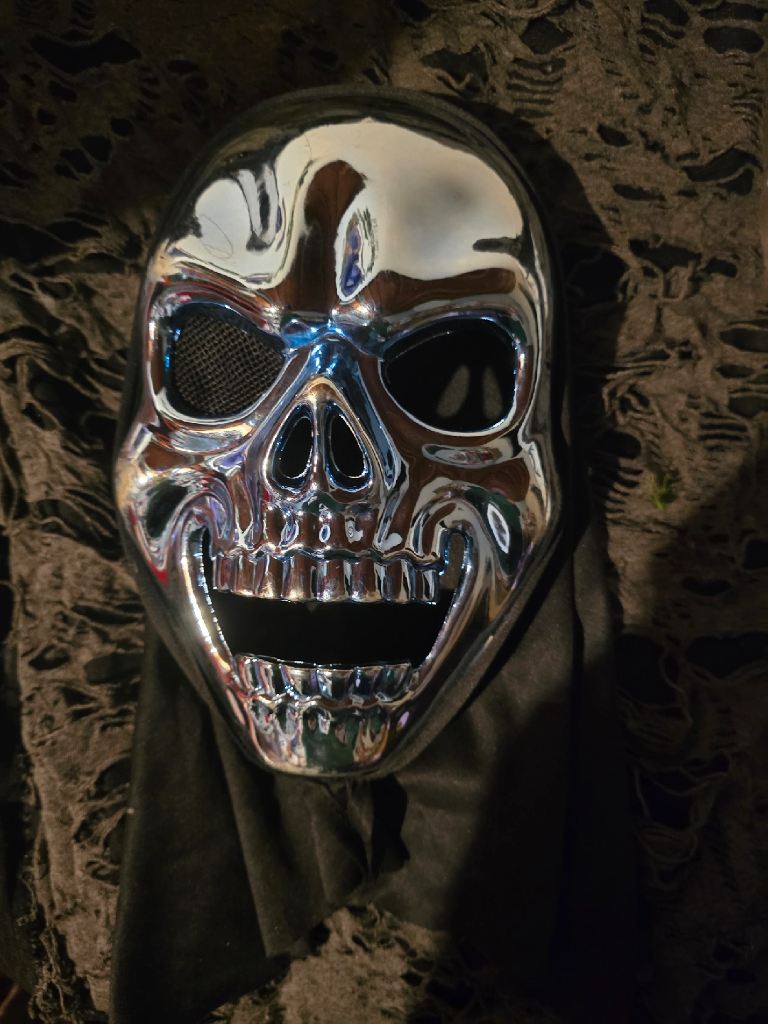 92Selling a silvery blue chrome skull mask, perfect for Halloween or costume parties! The mask is in good condition and has a mesh covering over one eye as one was removed to be used as a decoration a few years ago. It's a fun and spooky accessory to complete your look