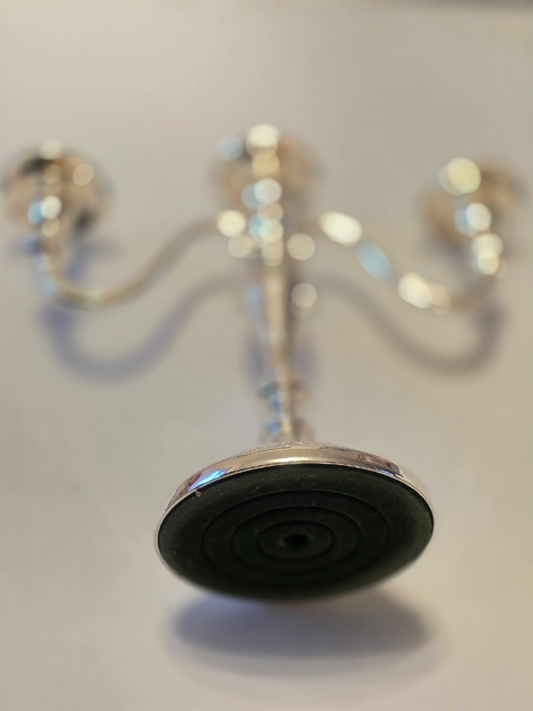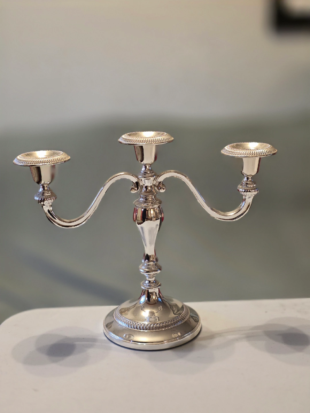 Selling a lovely silver candelabra that holds three candles! It's in great shape and would look beautiful on any dining table or mantelpiece. The base has a black felt bottom to protect surfaces. Approximately 10 inches wide at its widest point