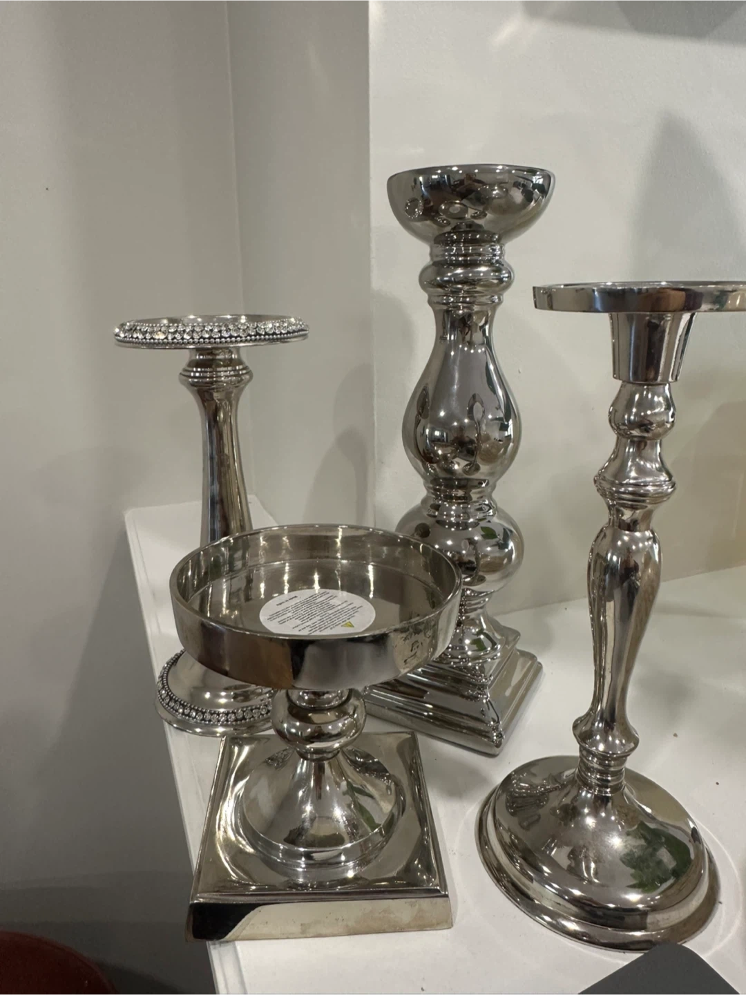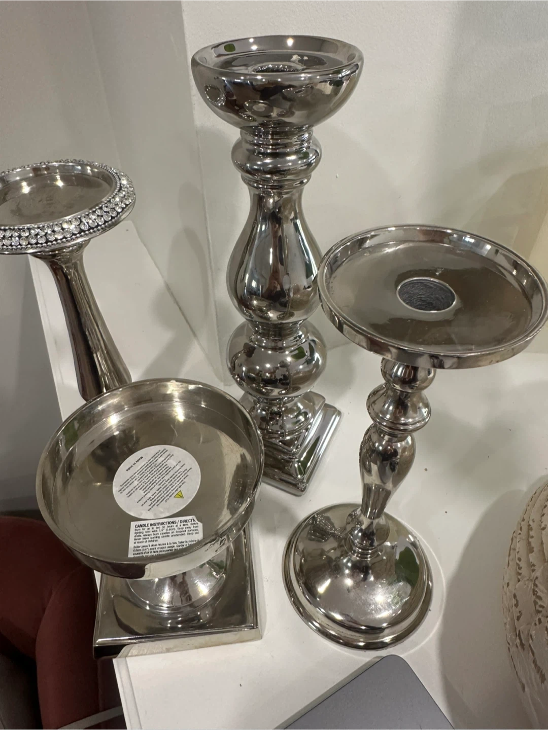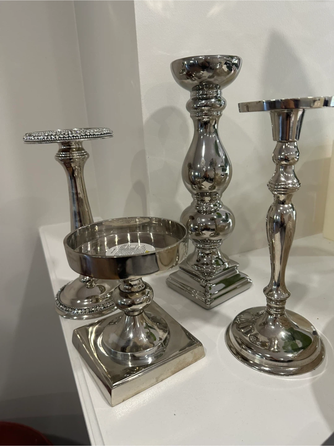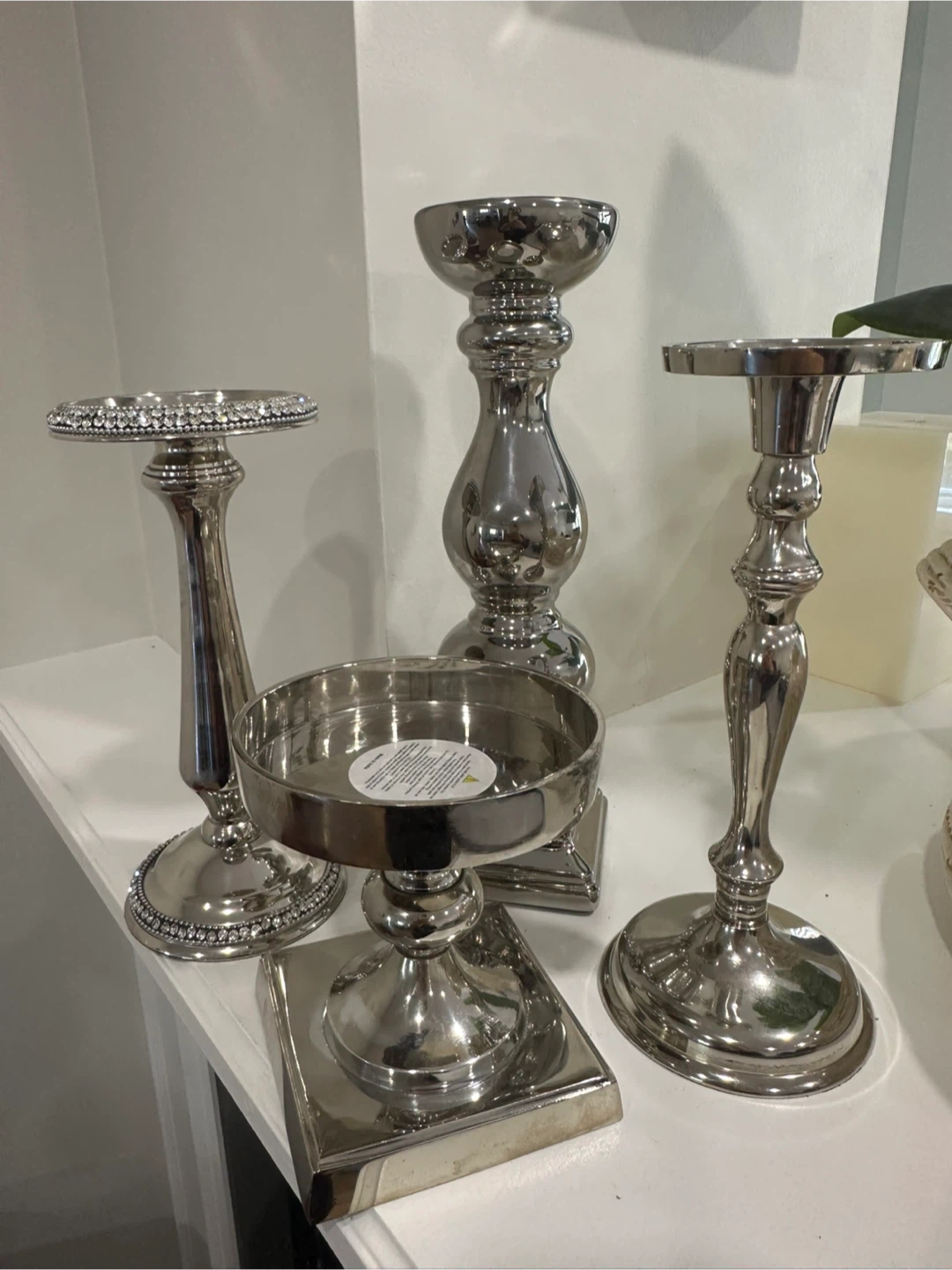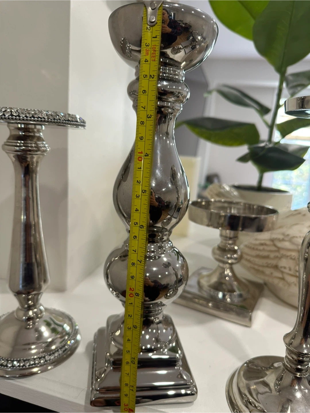 10Selling a set of 4 silver candle holders! These are perfect for adding a touch of elegance to any room. The set includes various heights and designs, as pictured. The tallest one measures approximately 15 inches in height.