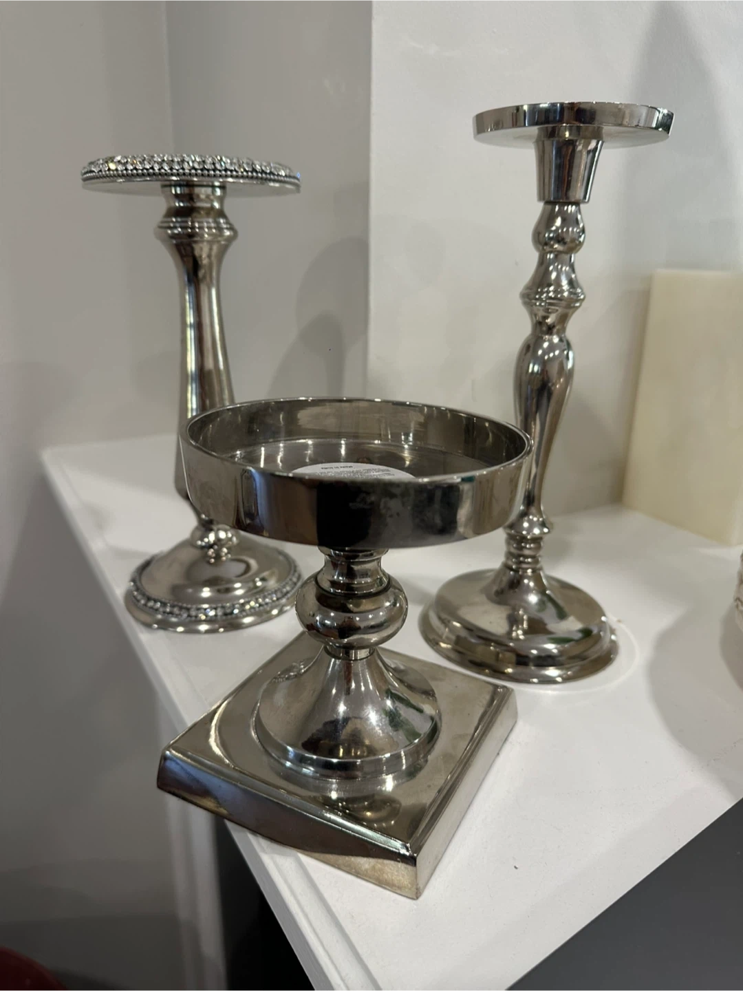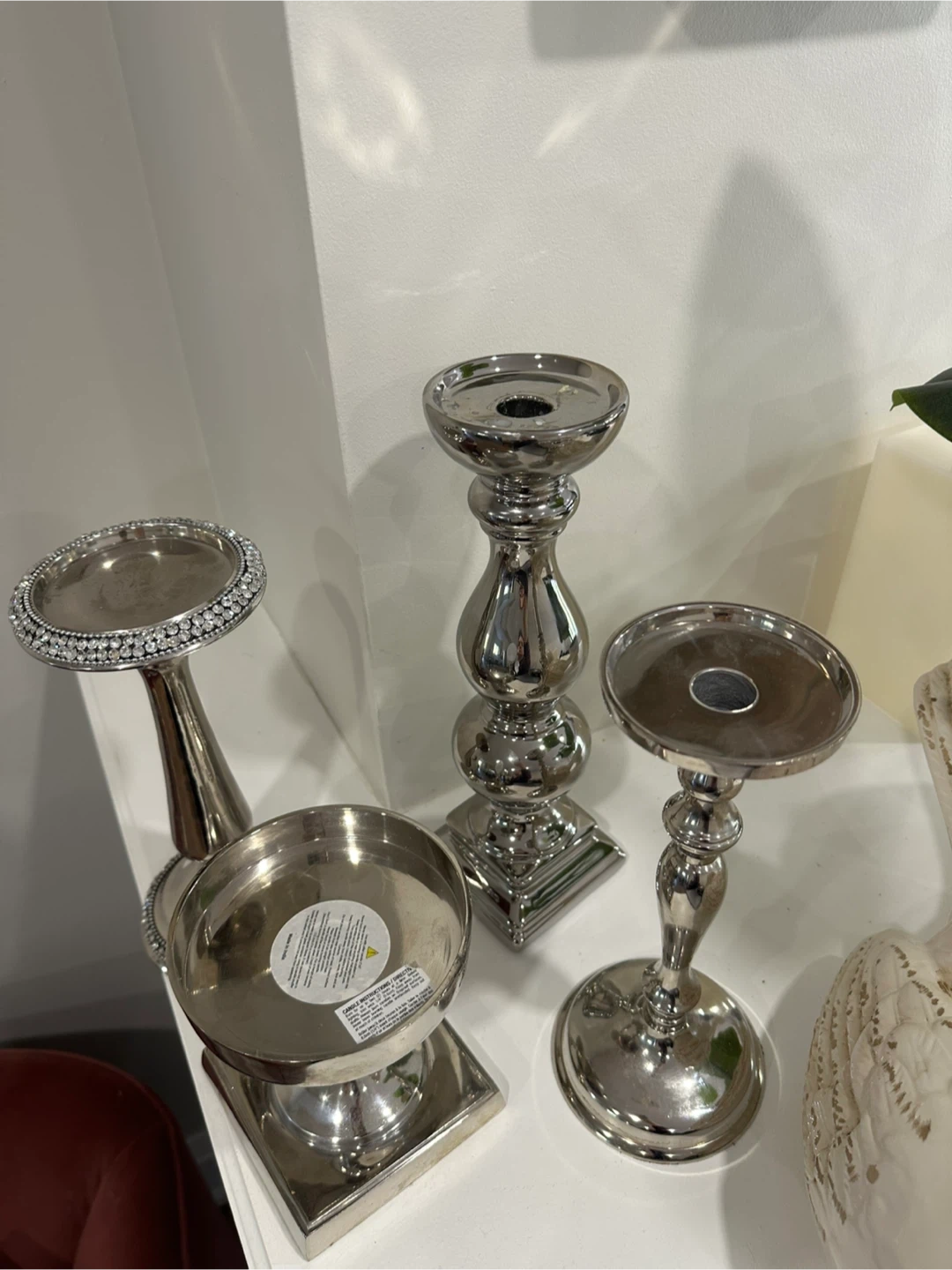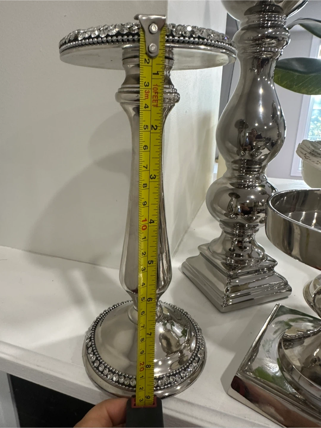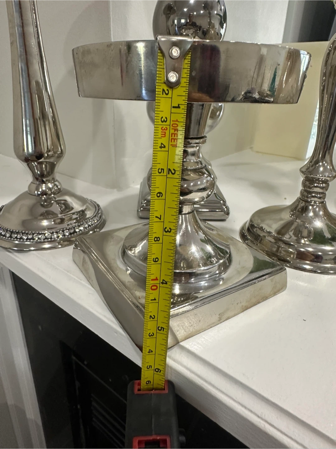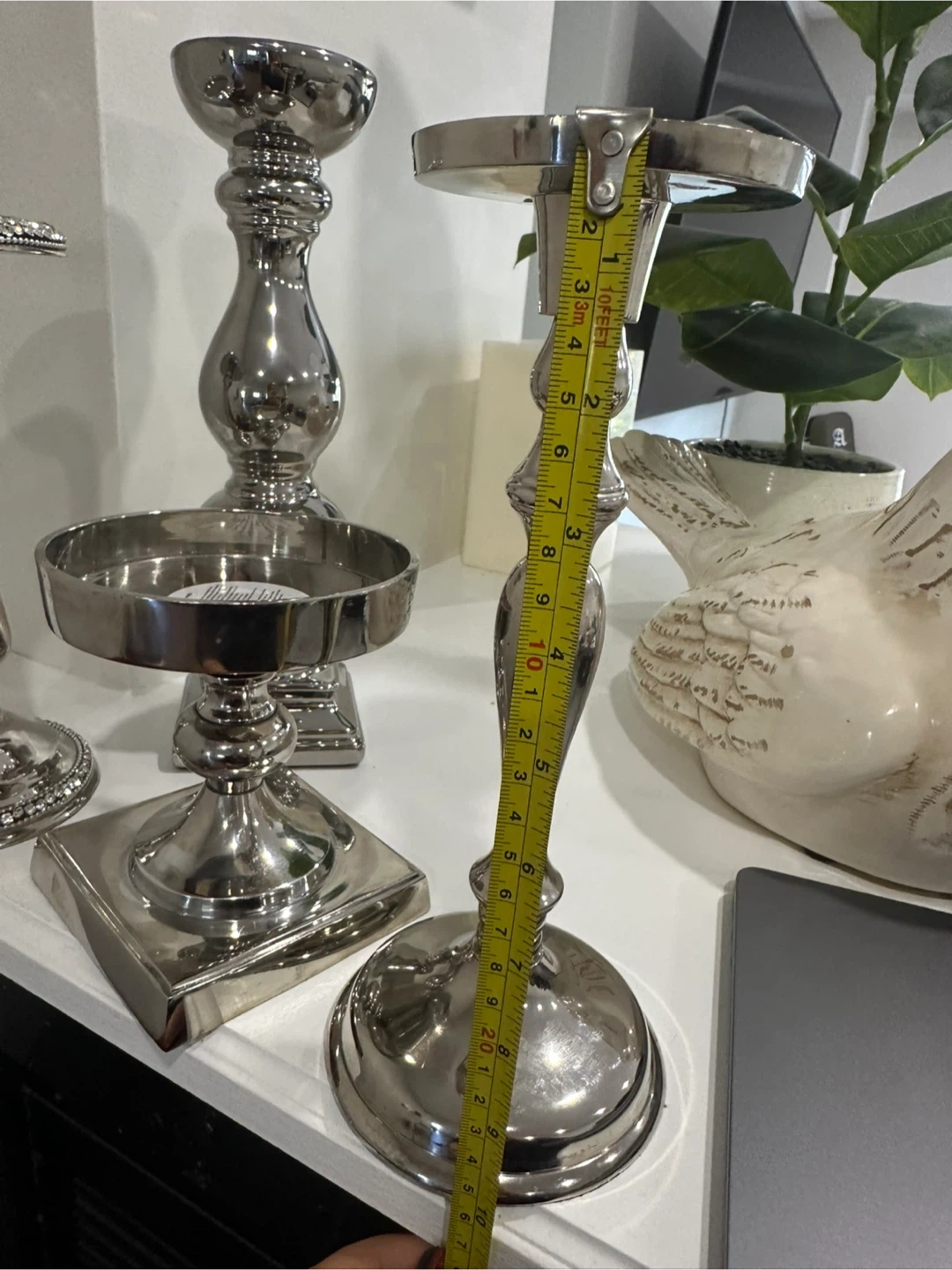 10Selling a set of 4 silver candle holders! These are perfect for adding a touch of elegance to any room. The set includes various heights and designs, as pictured. The tallest one measures approximately 15 inches in height.