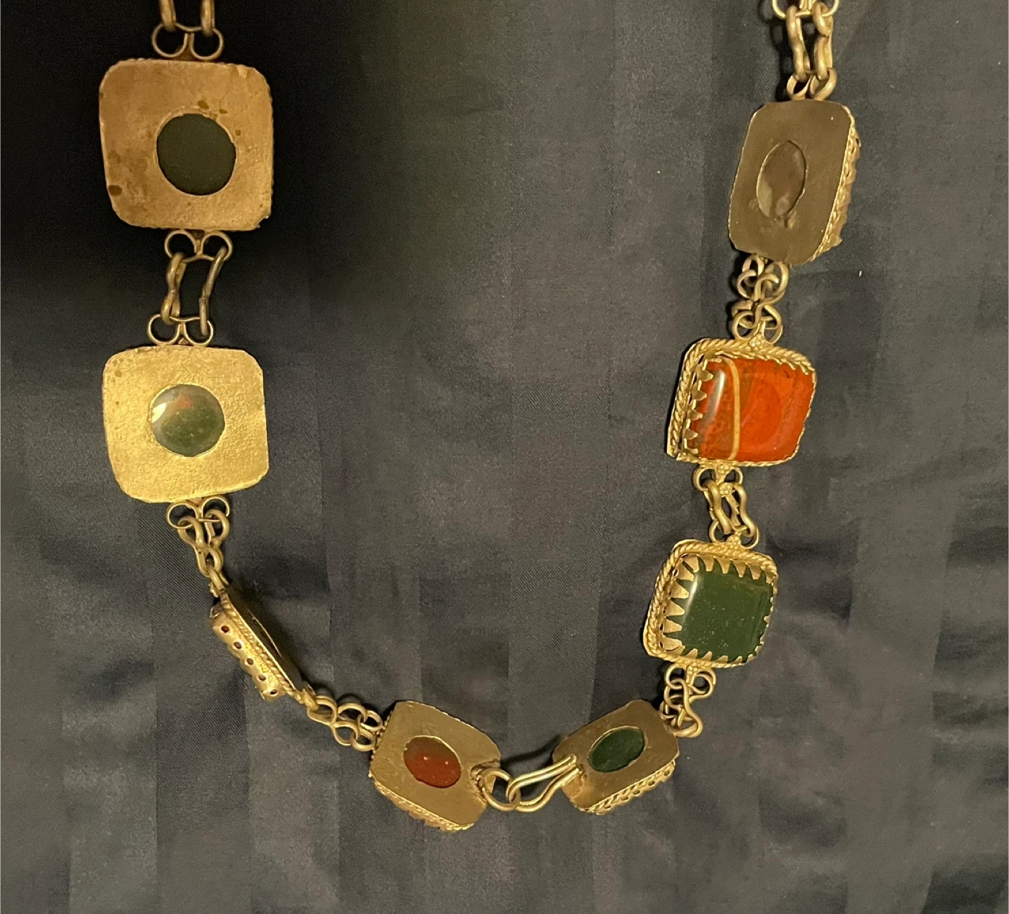 This vintage silver chain and assorted stone belt dates from the 1960’s. The full length measurement is 35cm.