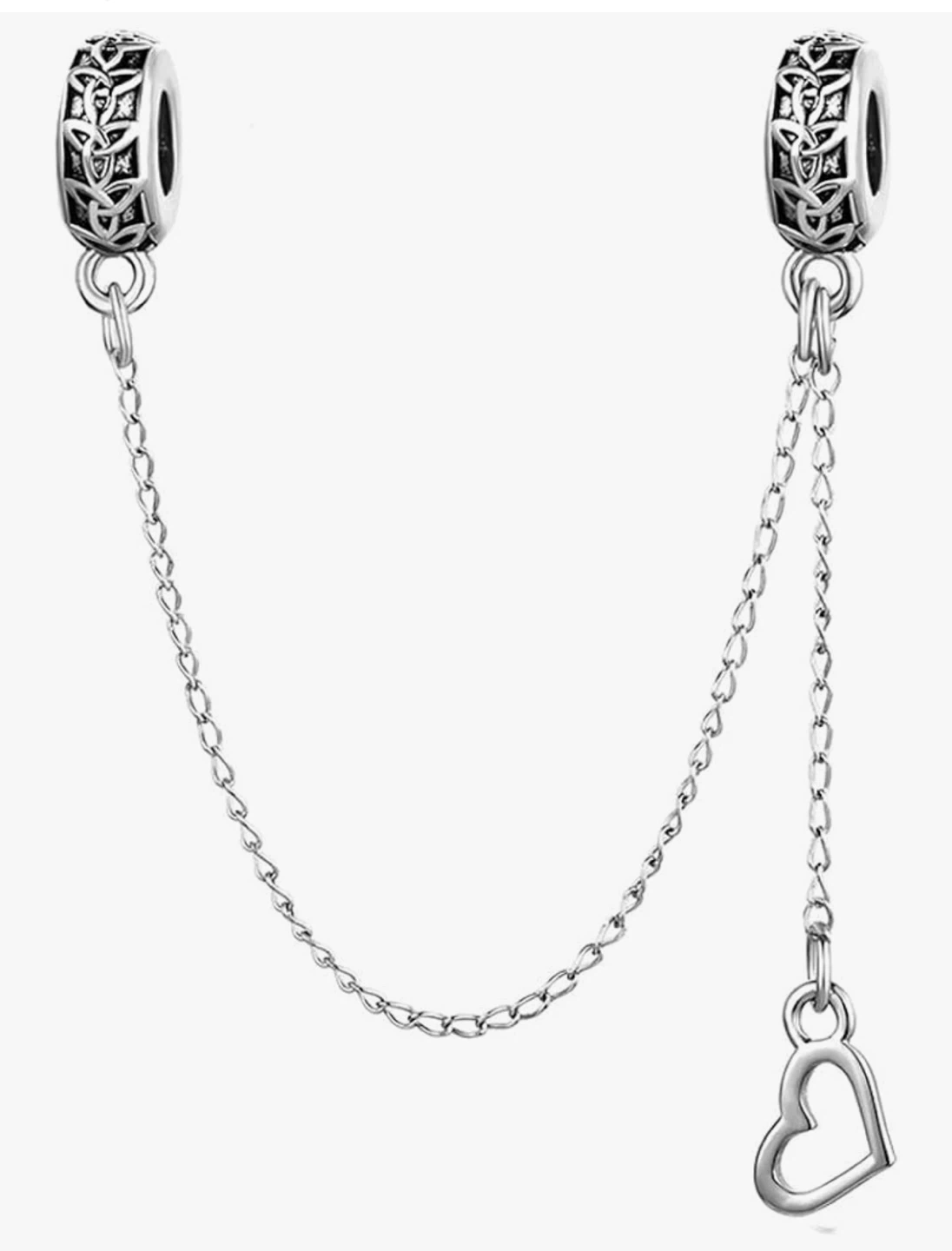 Here's a lovely silver charm bracelet safety chain! It features a heart charm and intricate Celtic knot designs on the stoppers. It's perfect for keeping your precious charms safe and secure on your bracelet