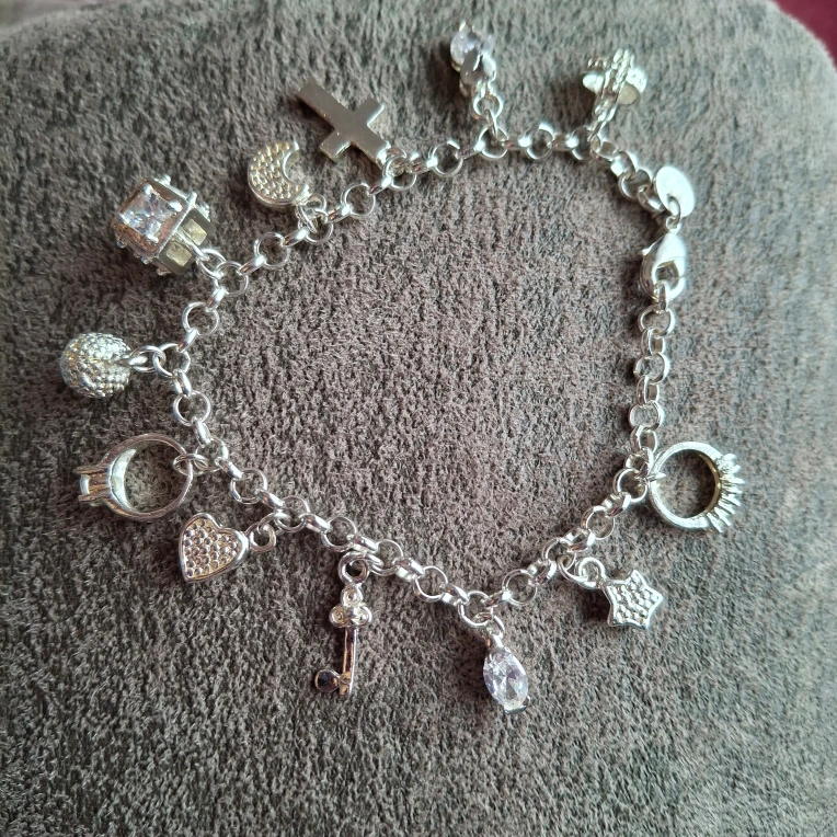 389Selling a lovely silver plated charm bracelet! It features a variety of charms including a cross, heart, moon, and other unique designs. A beautiful addition to any jewelry collection!