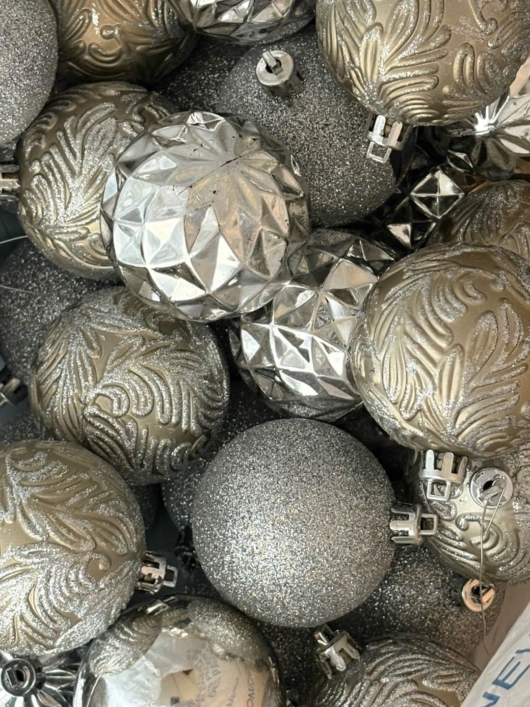 195Beautiful silver Christmas ornaments. Various textures and shapes. Perfect for any tree. Imagine how relaxing decorating your tree will be. Pick up Only