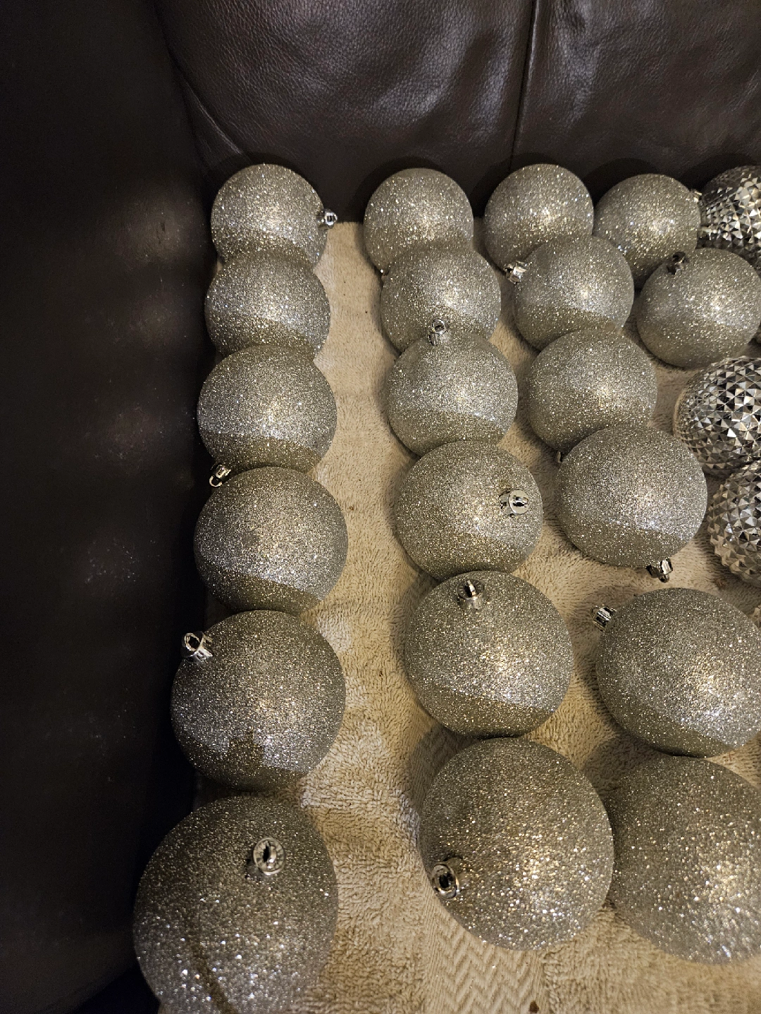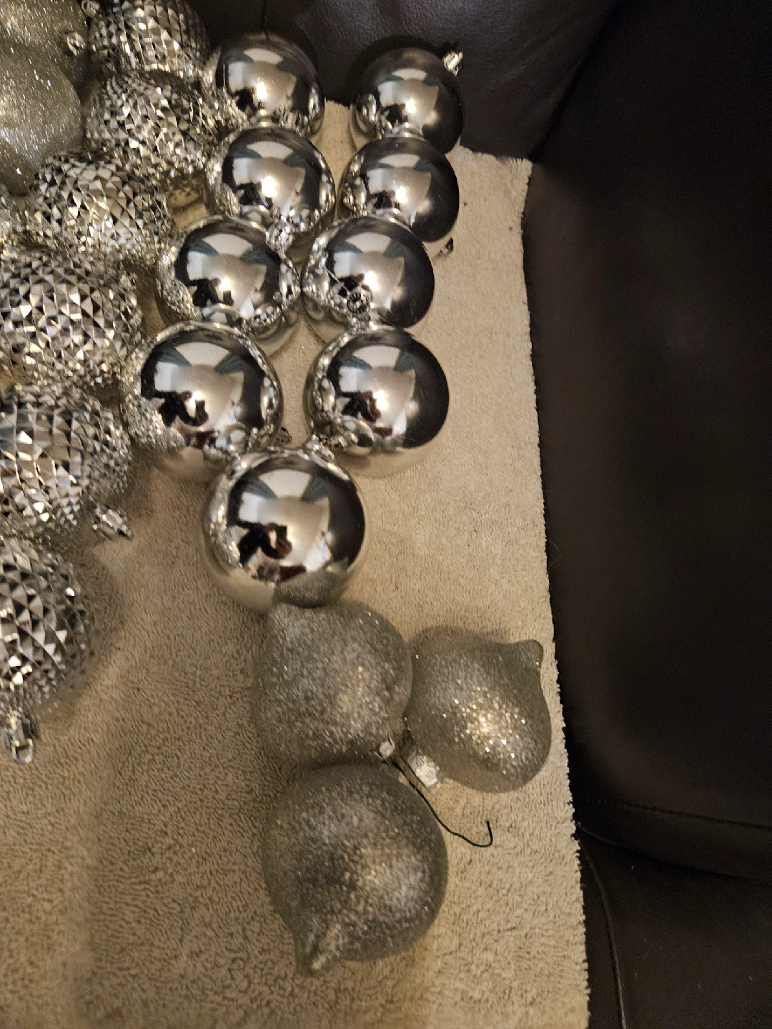 Selling a collection of 42 silver Christmas ornaments. There are a variety of textures and designs.