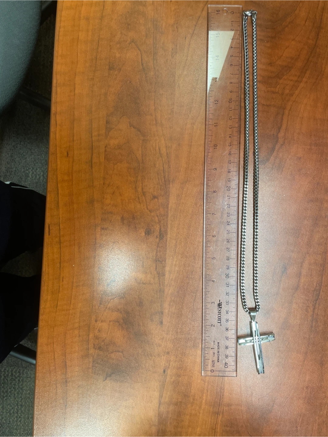 Selling a silver-toned cross pendant necklace. It is in great condition and features a classic design. The chain is a simple, durable style. Perfect for everyday wear!