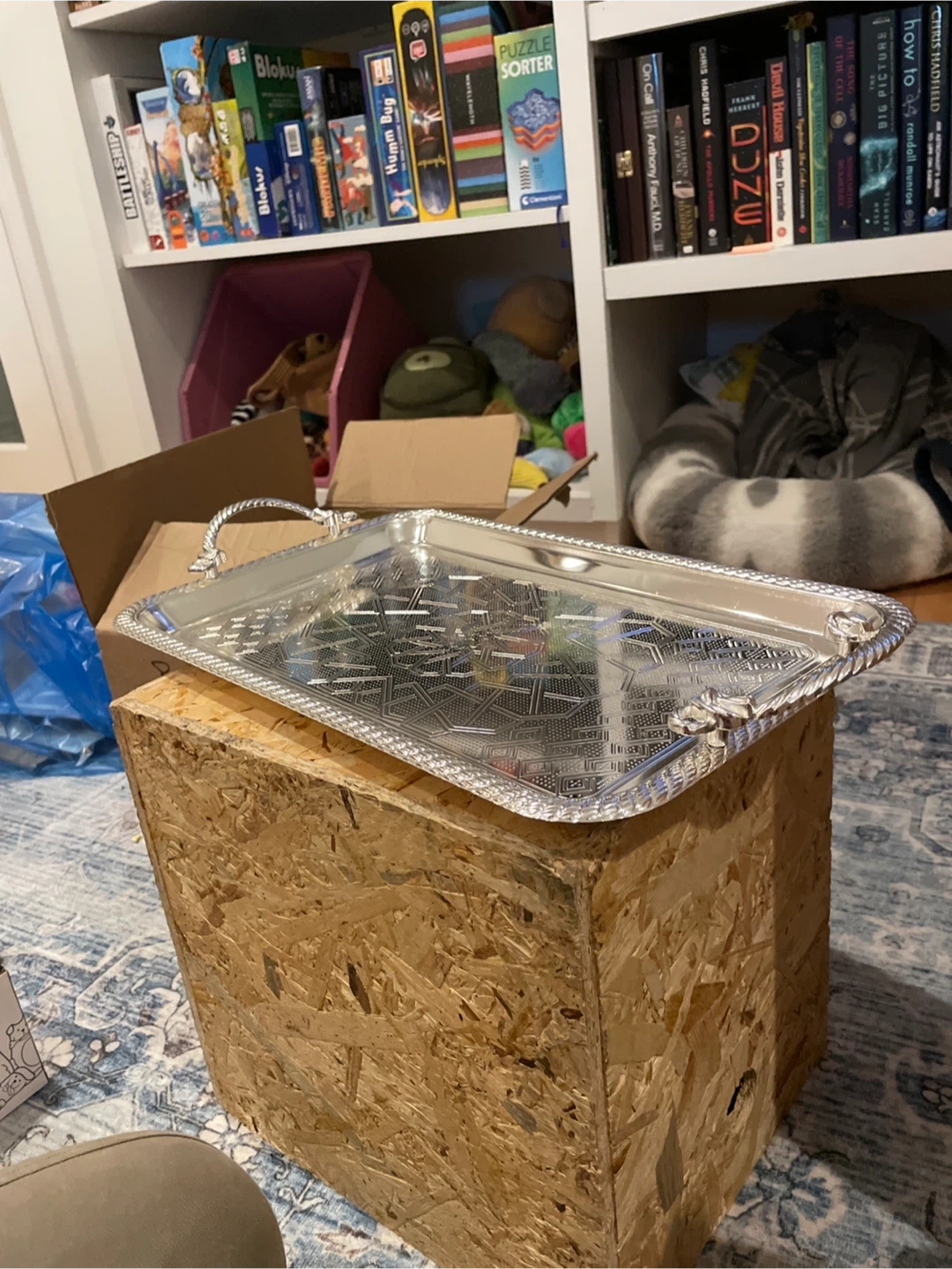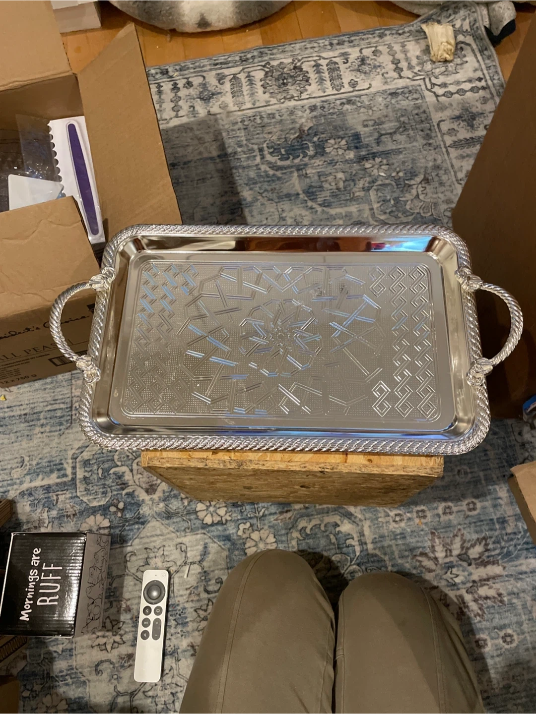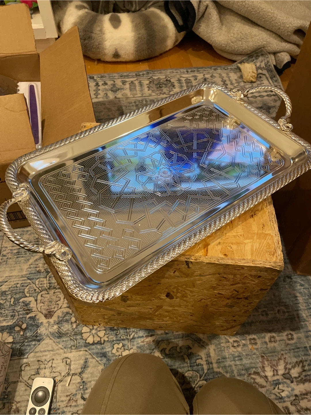30Selling a lovely silver decorative tray! It has a beautiful patterned design and sturdy handles on either side. Perfect for serving or adding a touch of elegance to your home decor