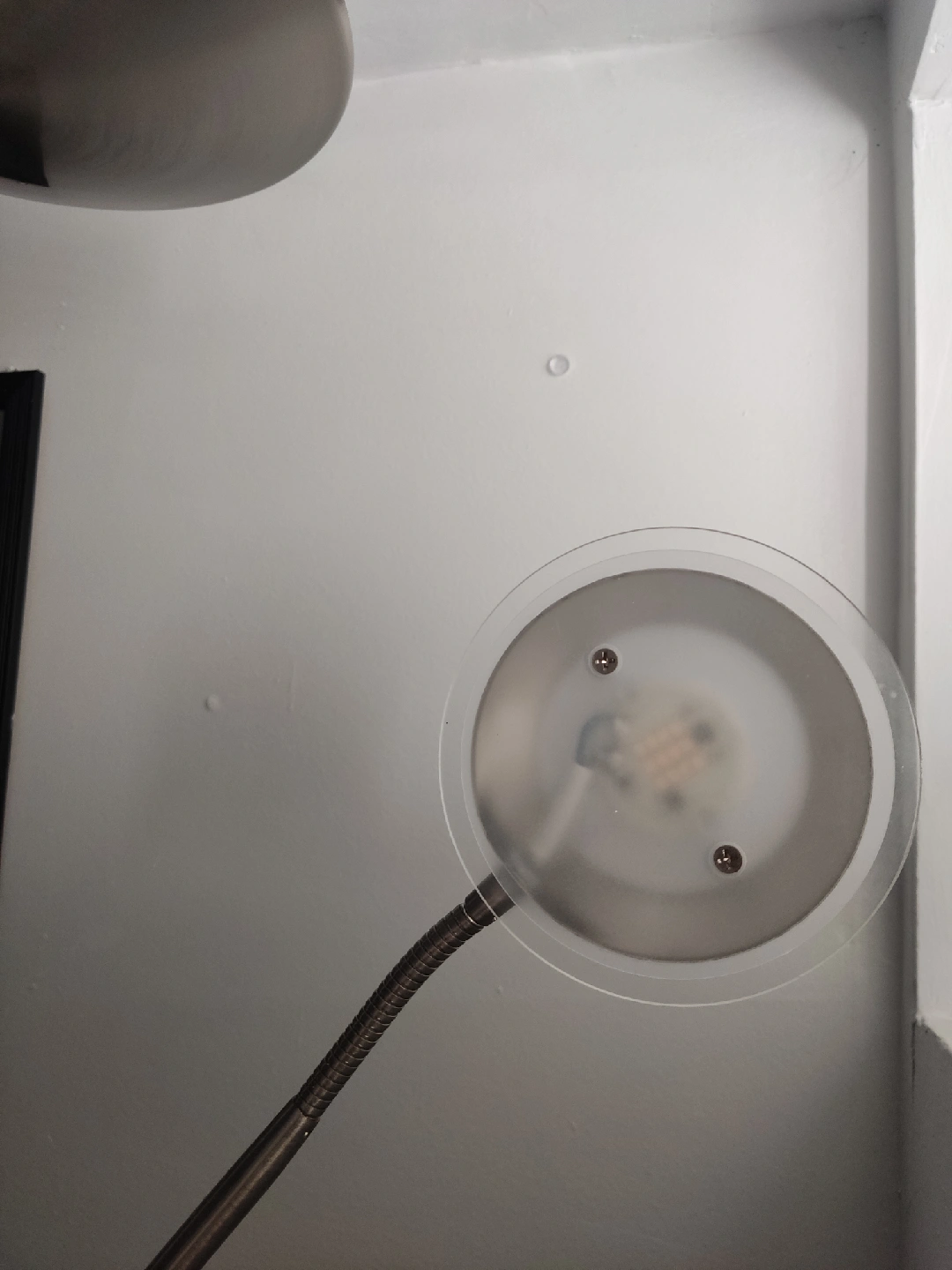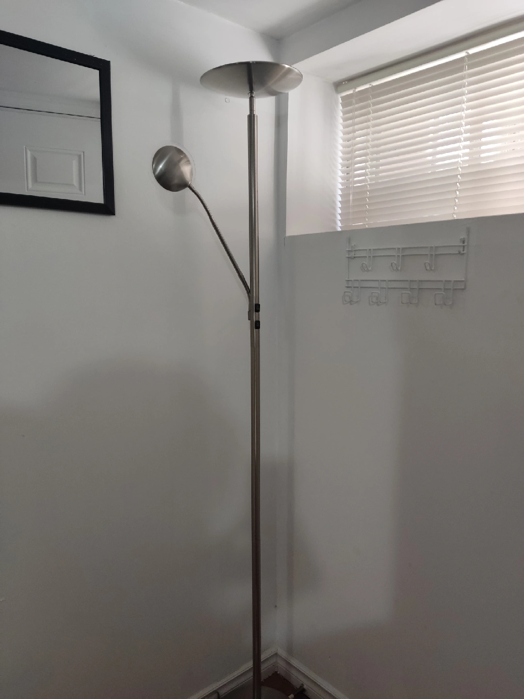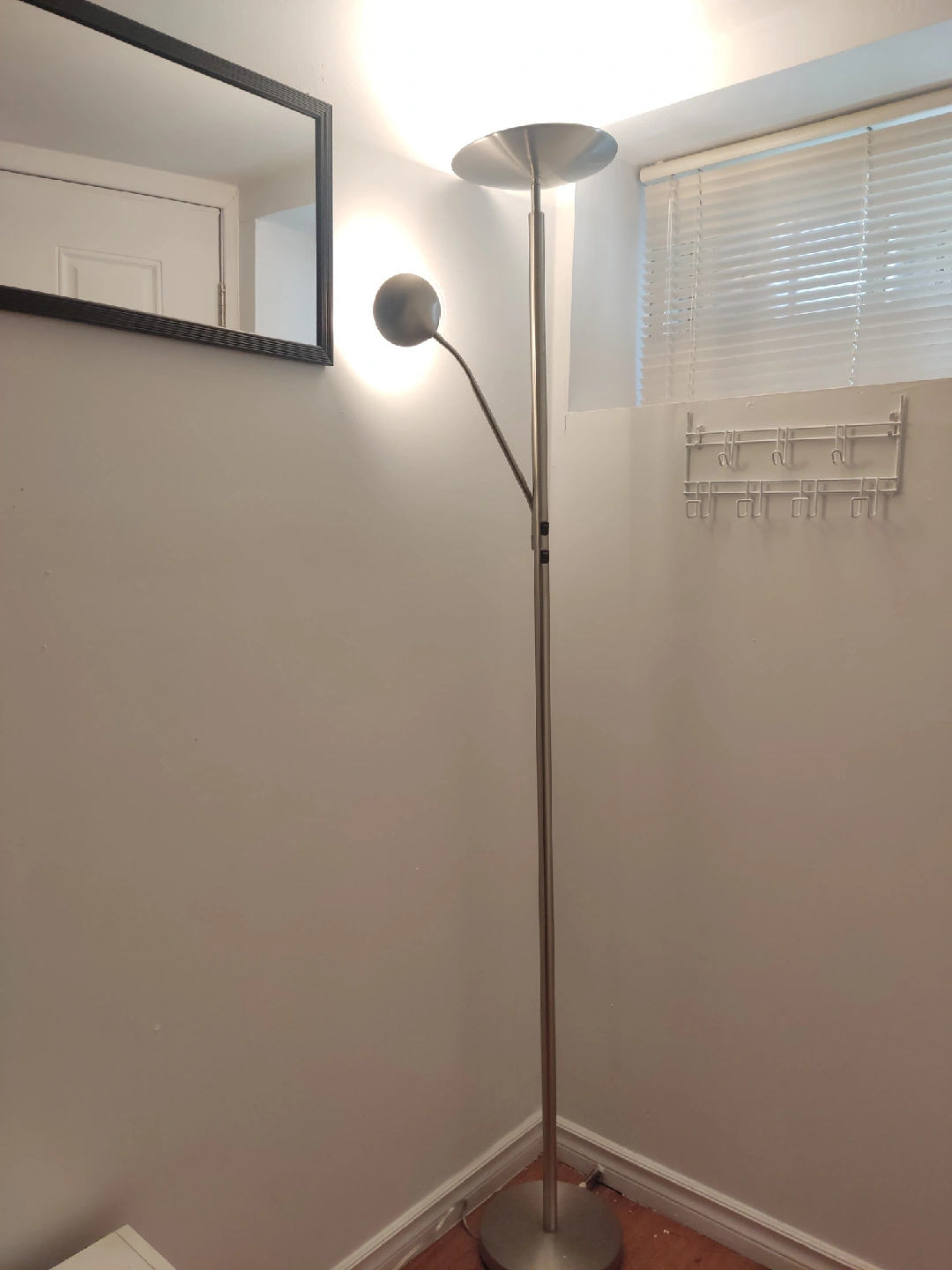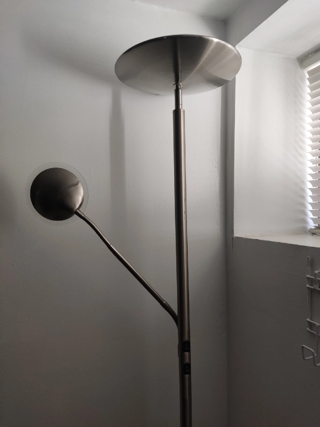 96Selling a silver-coloured floor lamp. Led. It features a sleek design with a round shade and an adjustable reading light. It would be perfect for adding some extra light to any room of the house!