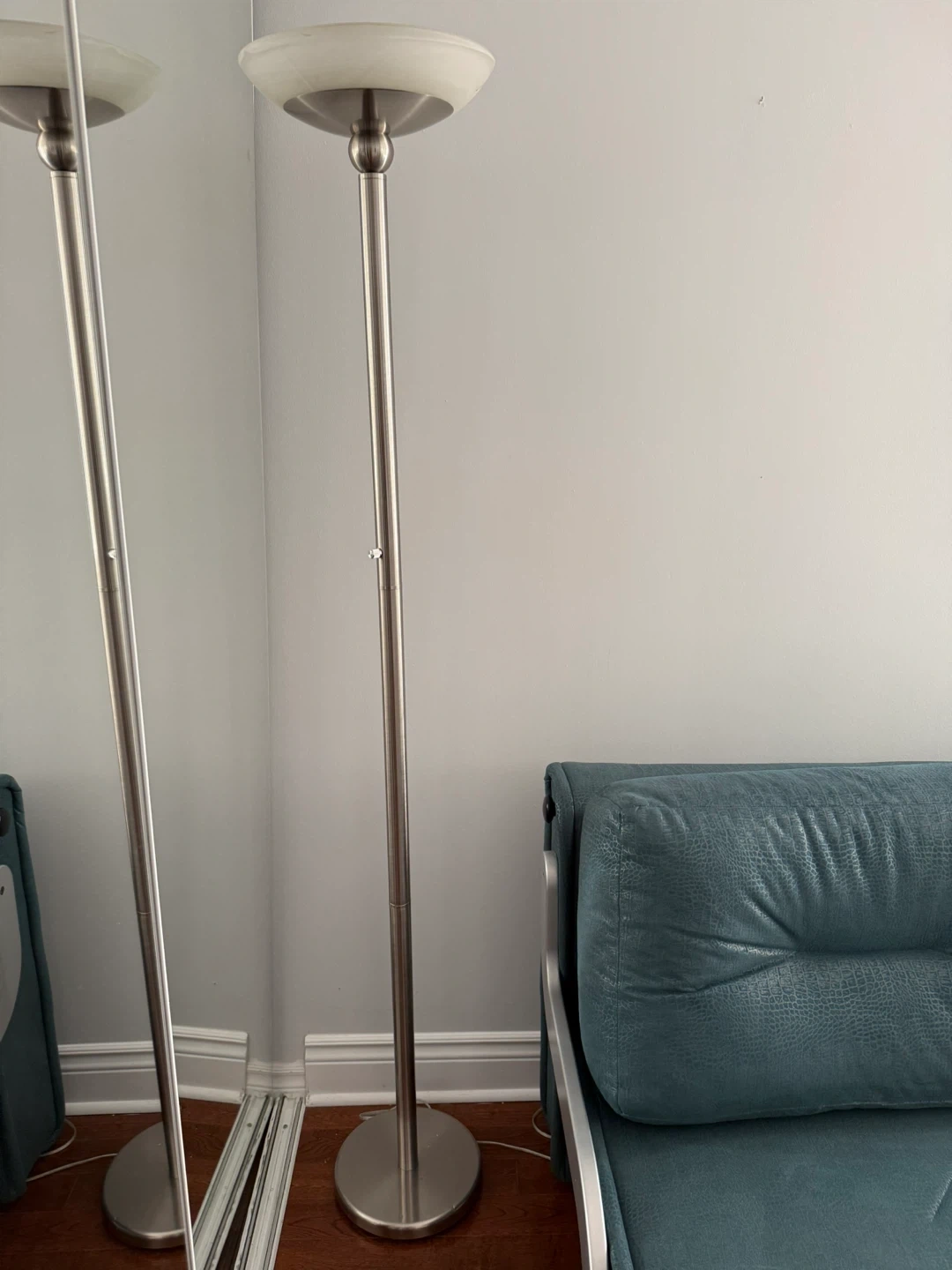 Selling a silver floor lamp in great condition! It has a simple and elegant design that would look great in any room. The lamp provides a soft, ambient light, perfect for creating a cozy atmosphere. It's a sturdy lamp and ready to brighten up your space