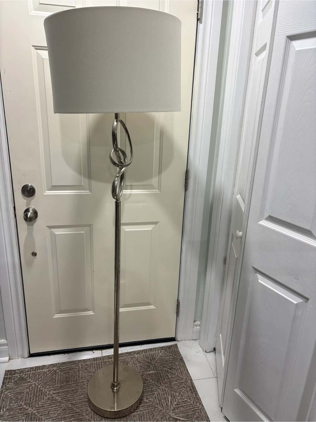 Here's a stylish silver floor lamp with a white shade! It would be a great addition to any room.
