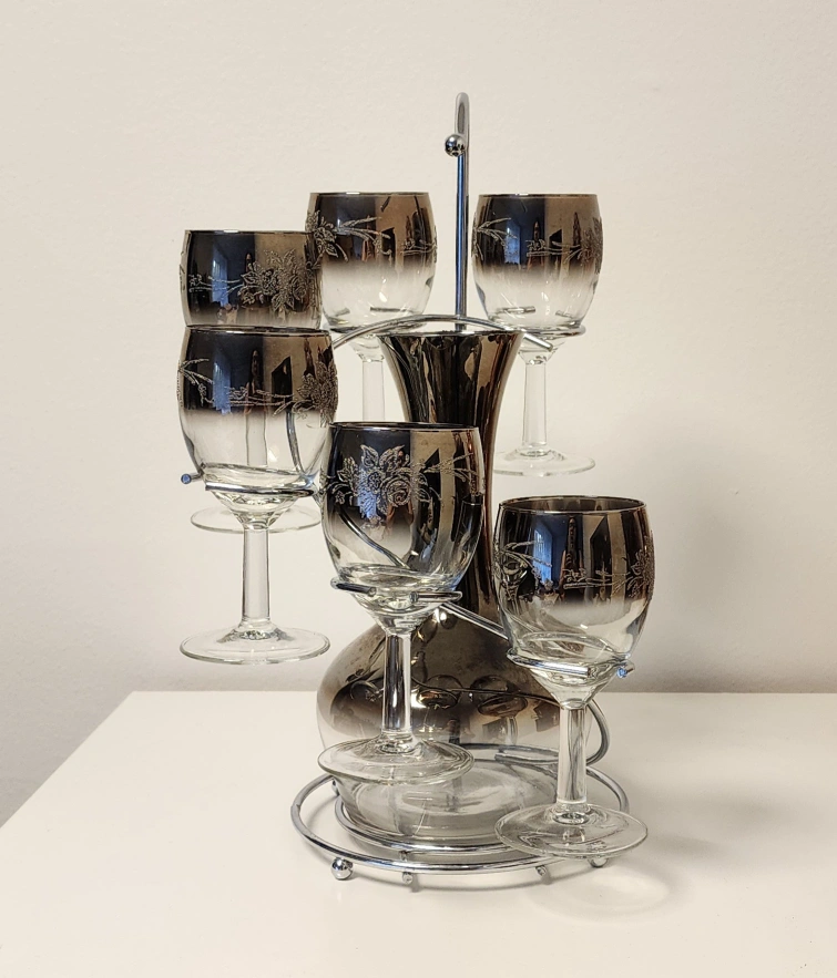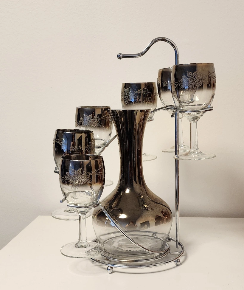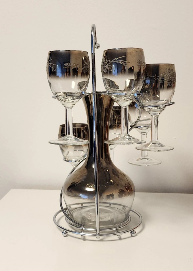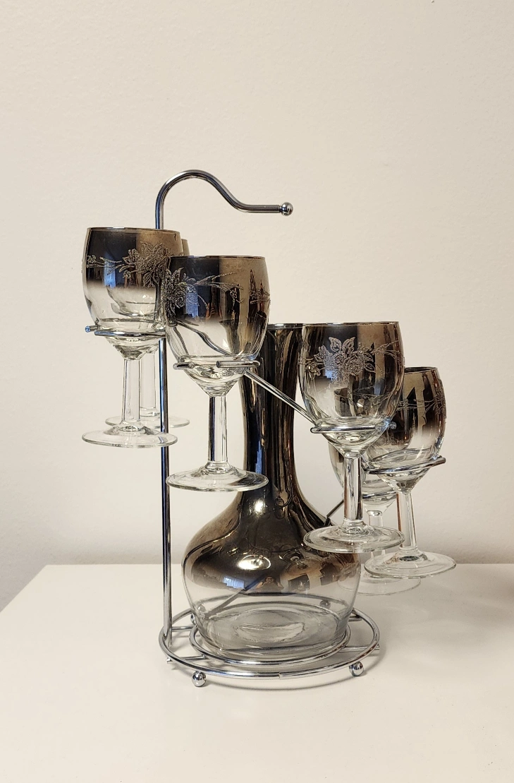 Here's a lovely silver floral wine decanter set! It comes with the decanter and 6 matching glasses, all displayed on a convenient chrome stand. Perfect for adding a touch of elegance to your next dinner party or get-together