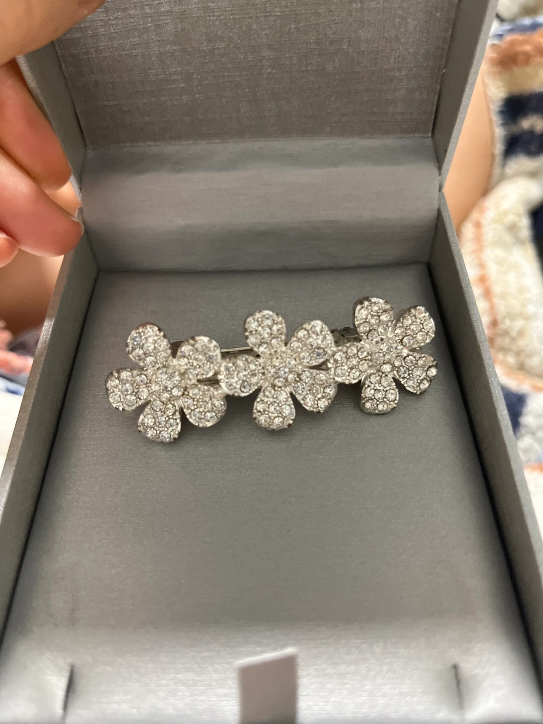 This is a lovely silver-toned hair clip featuring a floral design. It's in great condition. It would be a beautiful addition to any hairstyle!