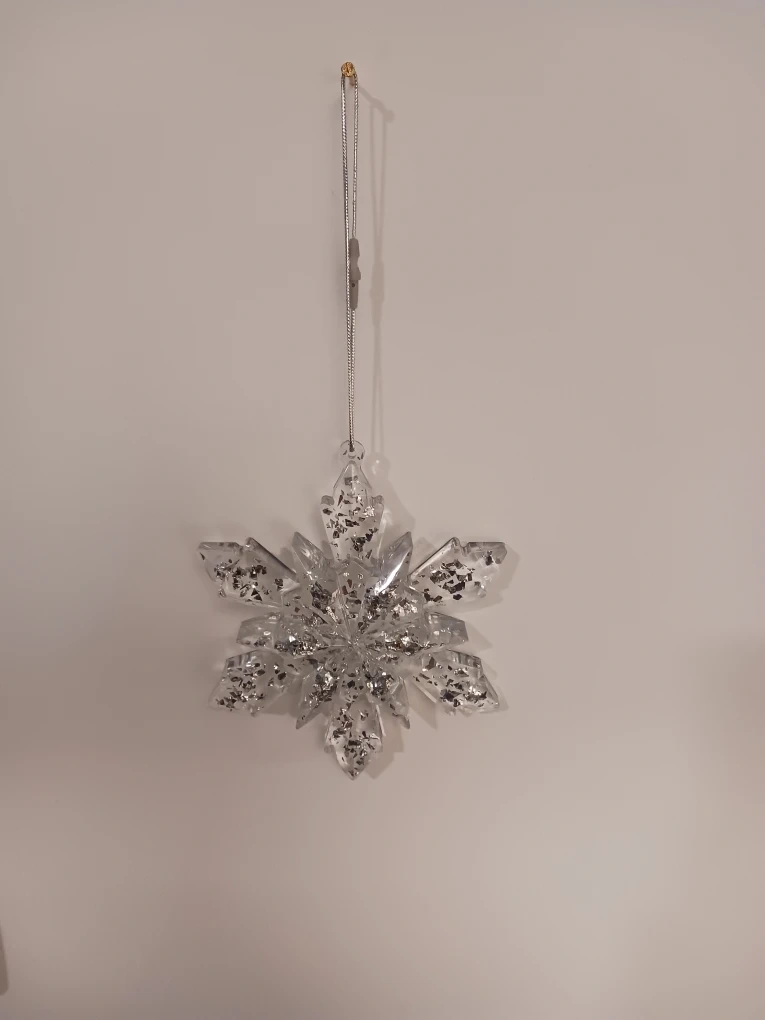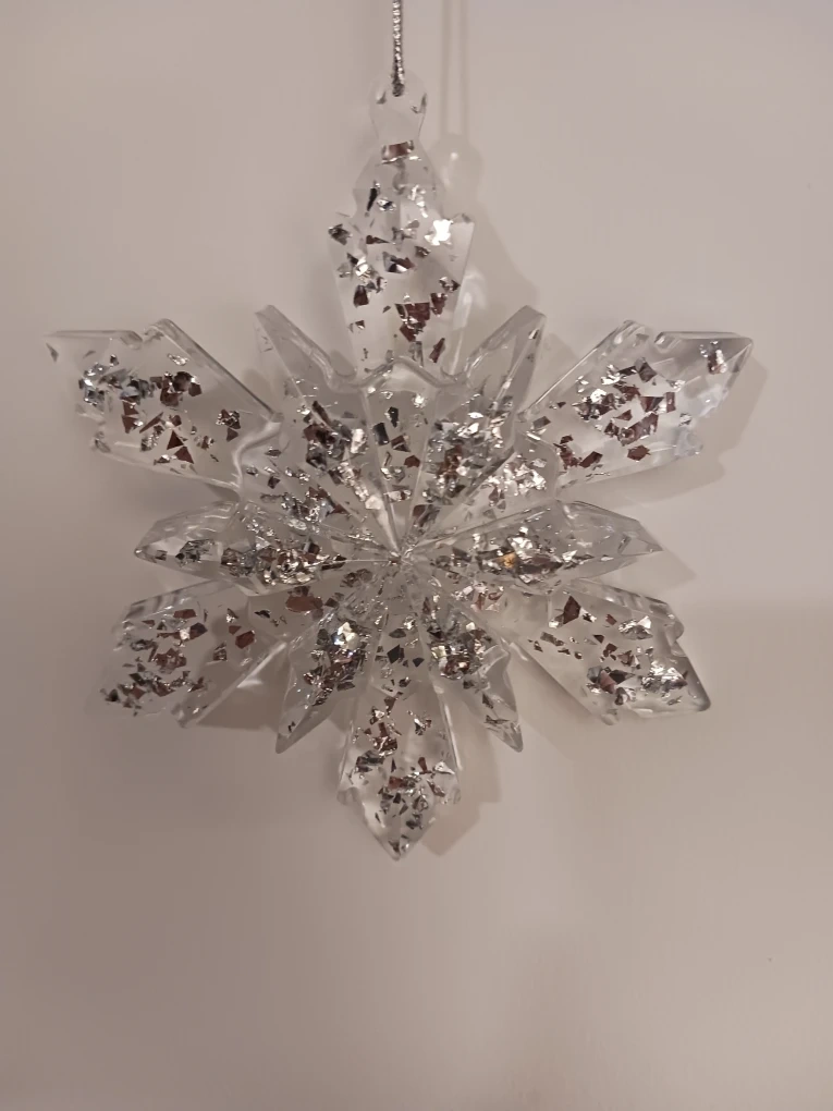 60This is a large clear resin snowflake ornament with silver glitter flakes inside! It would be perfect for decorating your home for the holidays, either on the tree or on a wall. A few together would make a nice winter scene. Lots of resin. Very thick. Sparkles like diamonds. Includes locking cord in silver. Never lose the hanging cord. Special requests for colours is okay. Thanks for looking.