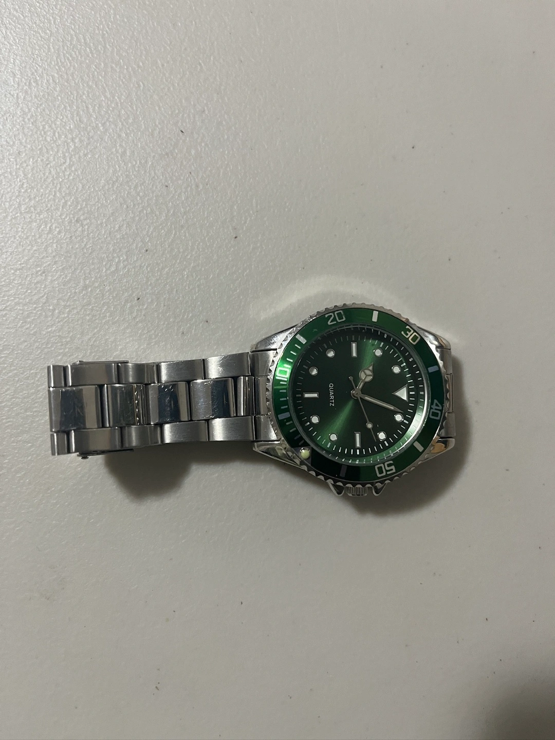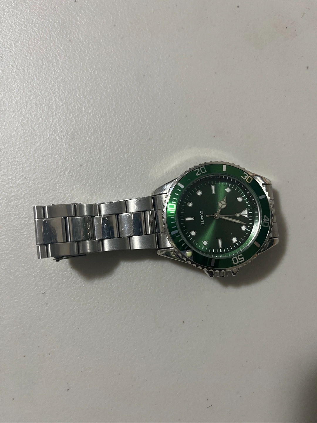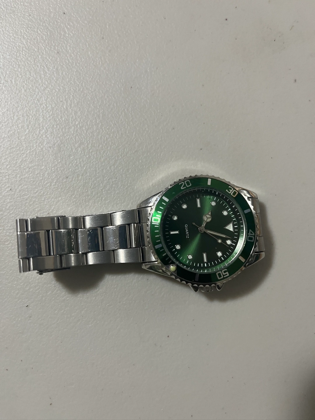 Selling a Quartz watch with a silver band and a green face. It's in great condition and ready for a new home!