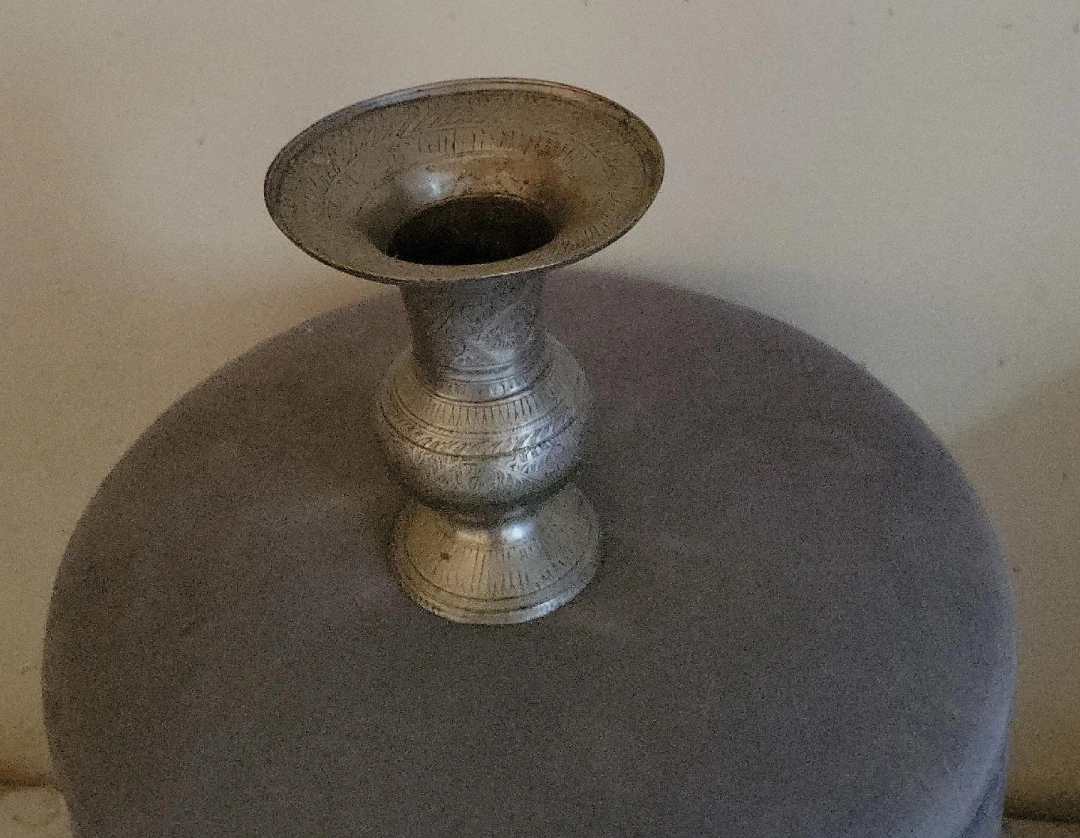 Selling a decorative silver metal vase. It has some intricate detailing on the surface. It's in good condition and would look great in any home!
