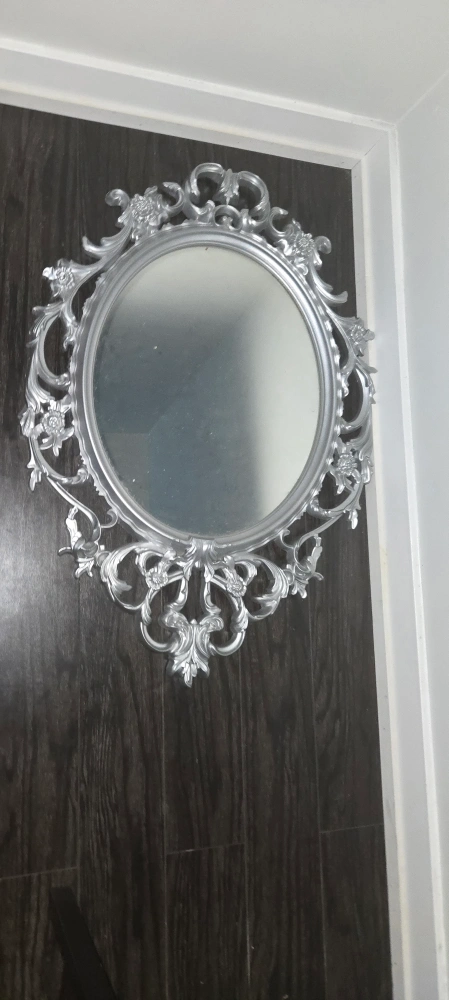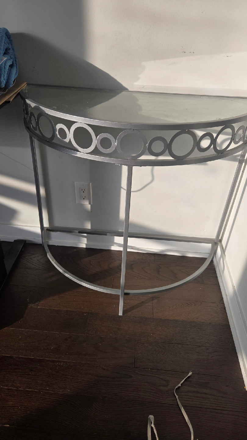 Selling a lovely silver oval mirror with a decorative, ornate frame. It would look great in an entryway or bedroom! free Cosole table