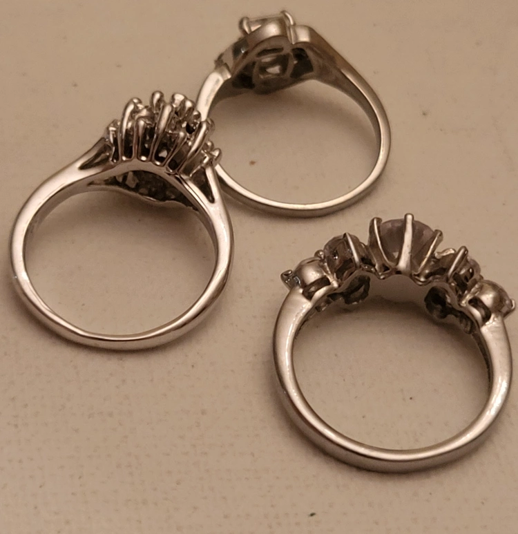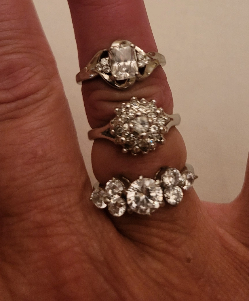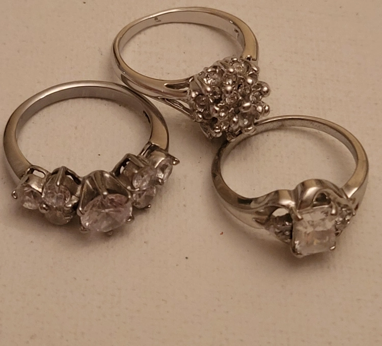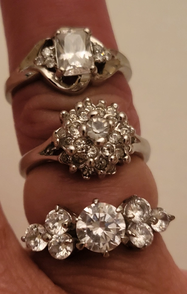 Selling a set of three lovely silver-tone rings, each featuring cubic zirconia stones. They're in great condition and ready to add a bit of sparkle to your day! $10 ea