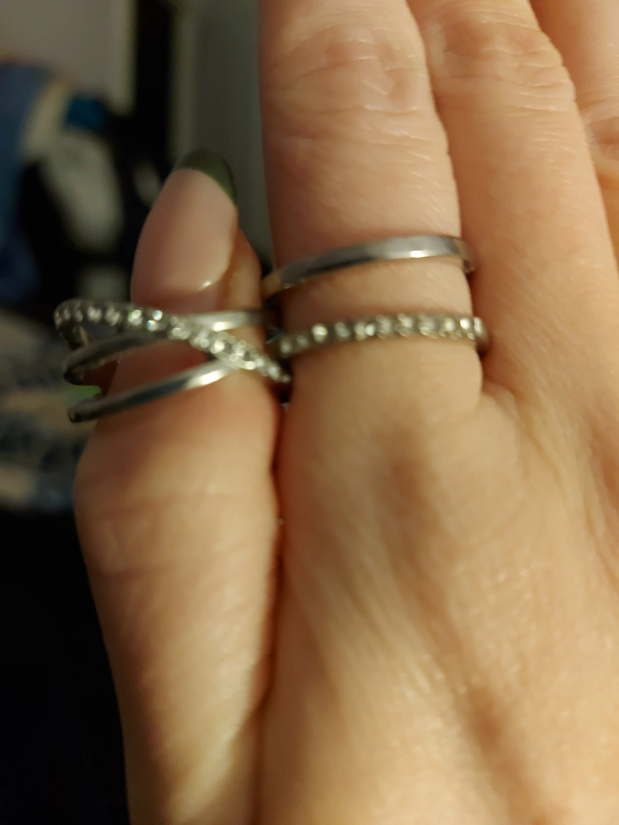 15Two silver rings, one with clear stones. One ring has a criss-cross design.