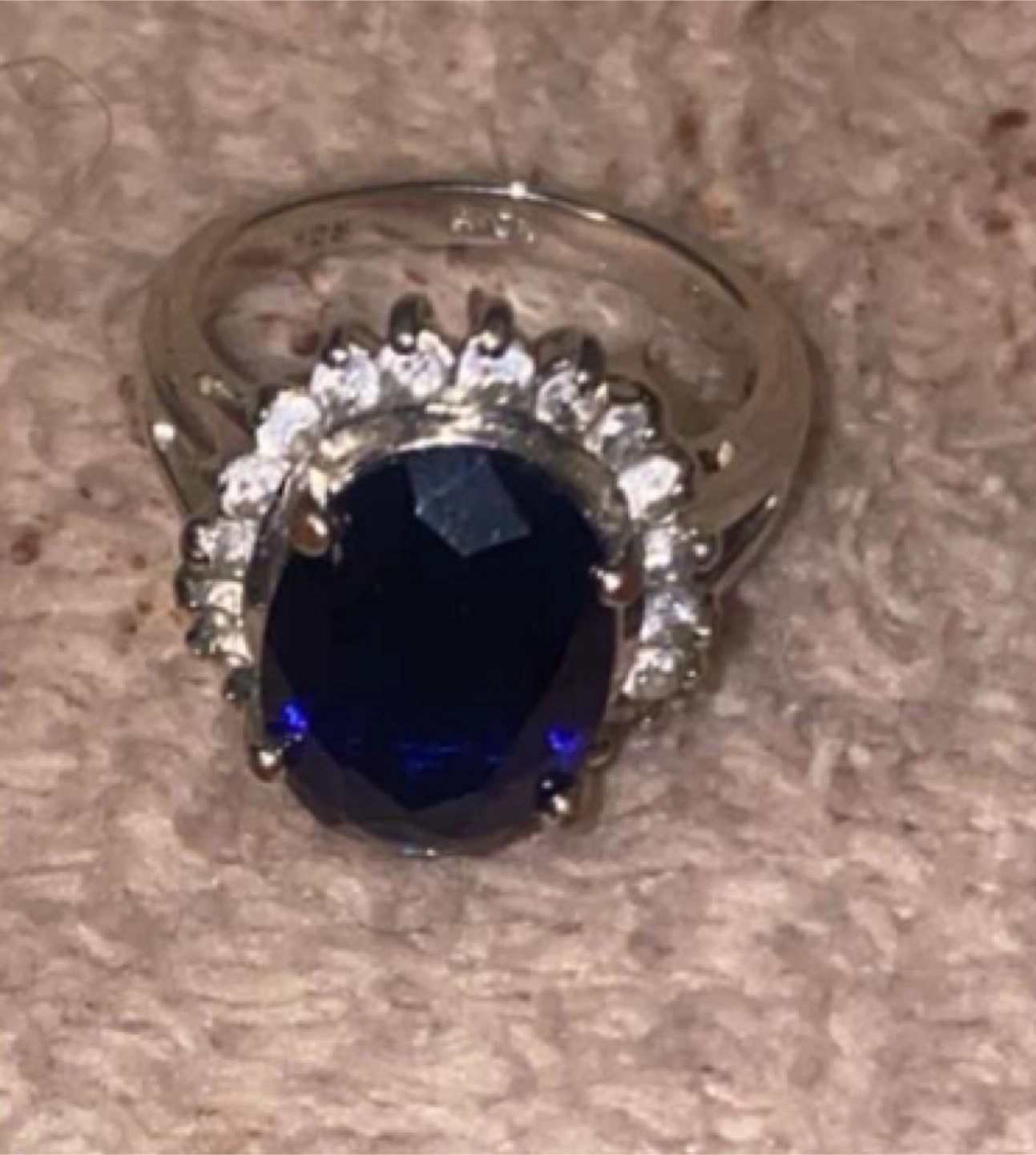 Selling a lovely silver ring featuring a beautiful blue stone. It has some smaller clear stones surrounding the centre stone. Perfect for adding a touch of elegance to any outfit