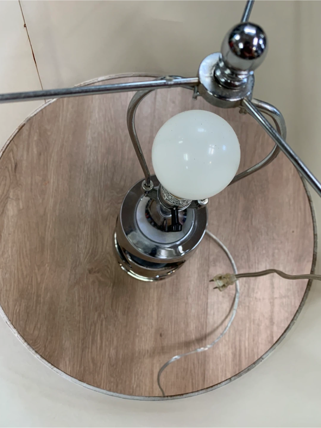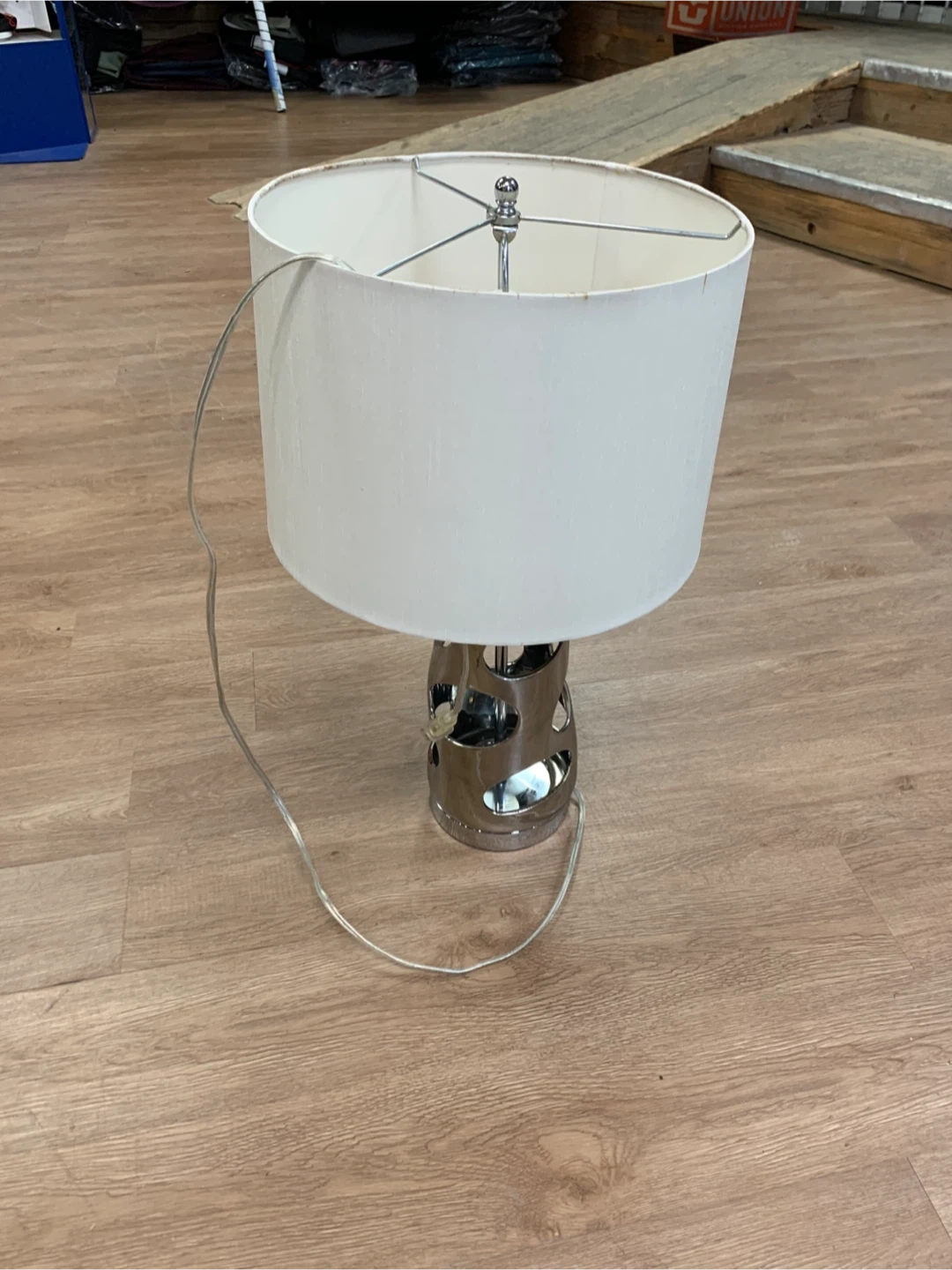 67Here's a stylish silver table lamp with a white shade that would look great in any room! The base has a unique open design. It's in great condition and ready to brighten up your space