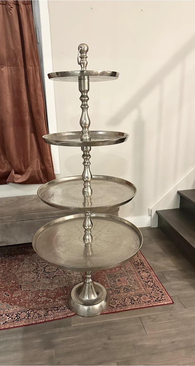 292Selling a silver tiered serving stand. It's in good condition and perfect for displaying desserts or appetizers at your next gathering. It comes disassembled for easy transport and storage, but is easy to put together