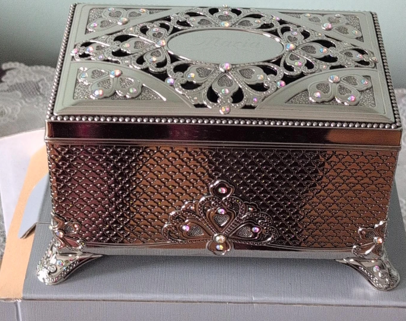 113Selling a lovely silver-tone jewellery box. It has a beautiful design with floral accents and small jewel-like details. The box has a textured pattern on the sides and ornate legs. Perfect for storing your precious items