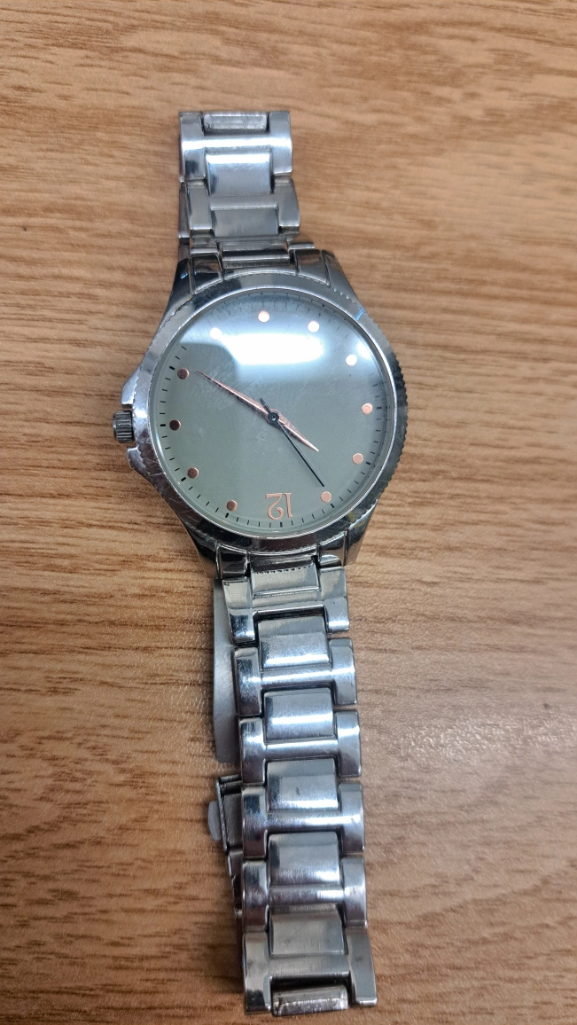 Selling a ladies watch with a silver-tone band and a light green face. It's in good condition and ready for a new home!