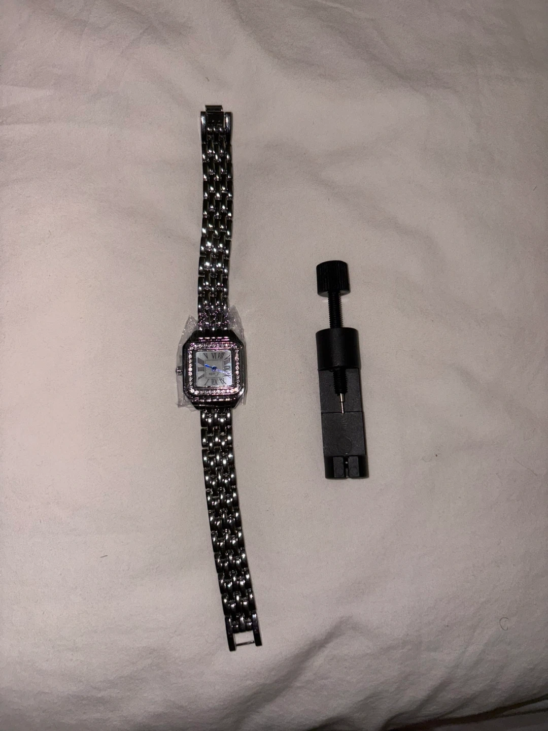 Selling a ladies' watch with a silver-tone link bracelet. It has a square face with what looks like crystal accents around the perimeter. Also included is a tool that I believe is used to adjust the band