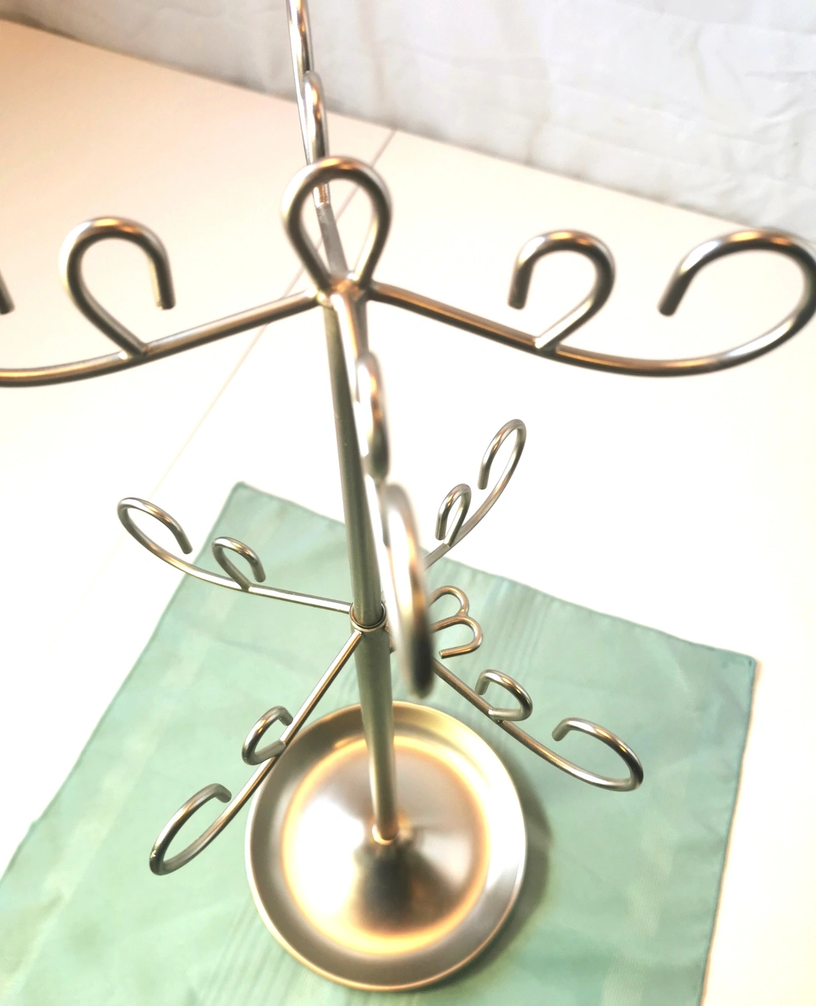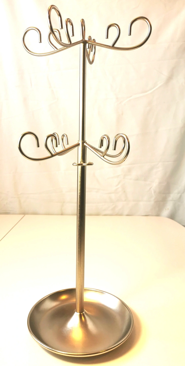 60This Silver-Tone Metal Jewelry Display Tree is a stylish and functional organizer for necklaces, bracelets, and earrings. With a round shape and a base dish, it can hold more than 25 pieces of jewelry. The vintage design from the 1990s adds a touch of elegance to any room. The silver color and metal material make it a chic addition to your jewelry collection. Perfect for women looking for a convenient way to showcase and organize their favorite accessories. Height 19 inches CONDITION: Good vintage condition light wear please see detailed photos as part of the description
