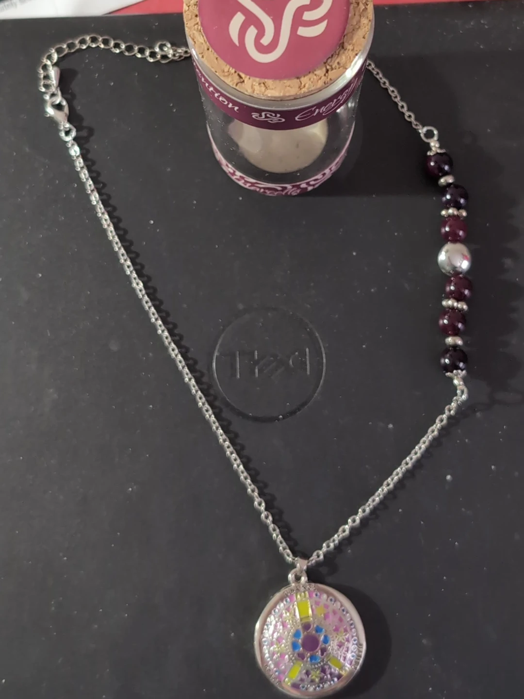 176Silver tone necklace with a round pendant featuring a colourful design. The necklace also has a section of beads in burgundy and silver tones. Perfect for adding a touch of sparkle to any outfit
