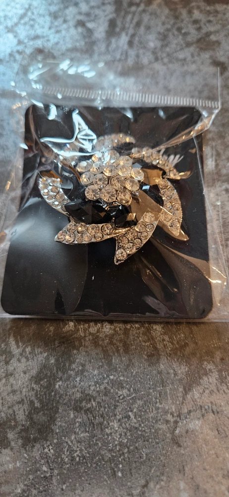 This is a brand new silver-tone crab brooch. It's adorned with clear and black rhinestones, adding a touch of sparkle to any outfit! It's still in its original packaging. Makes a great Stocking Stuffer!