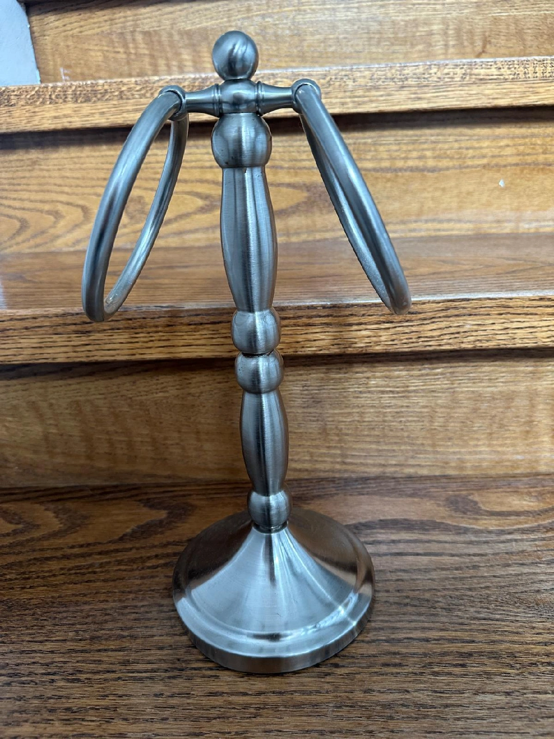 18Here's a towel ring stand in a silver colour. It's in great condition and ready to hold your towels!