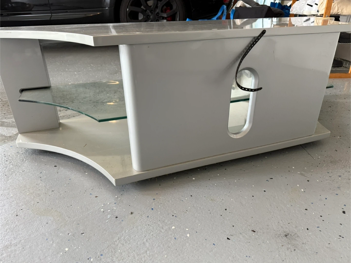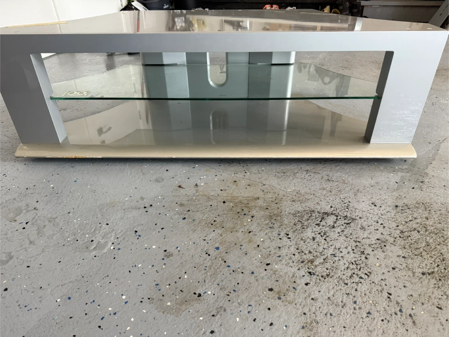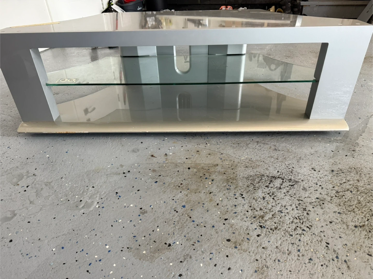 Selling a silver TV stand that features glass shelves. It's in good condition and ready for a new home! Perfect for organizing your entertainment setup. Height 17inches Wider56 and half Depth 19and half