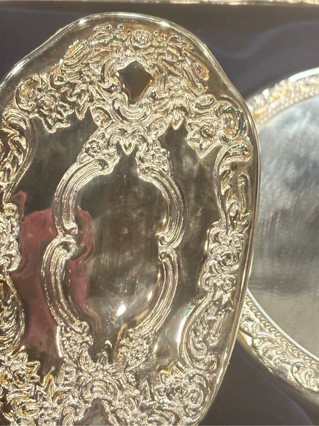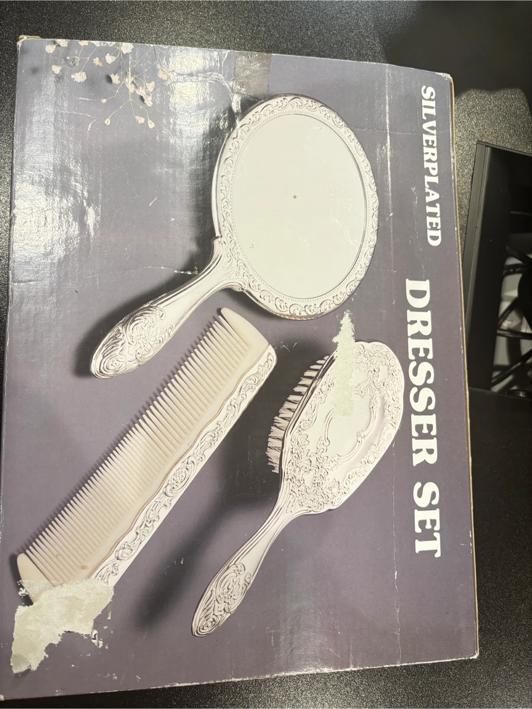 18Selling a beautiful silverplated dresser set by Elegance Silverplate! It includes a hand mirror, hairbrush, and comb, all in excellent condition. The set comes in its original box. Item is like new condition . Got it in an auction new condition but when I opened it , there are a few tarnishes for improperly stored in the box which can be removed .