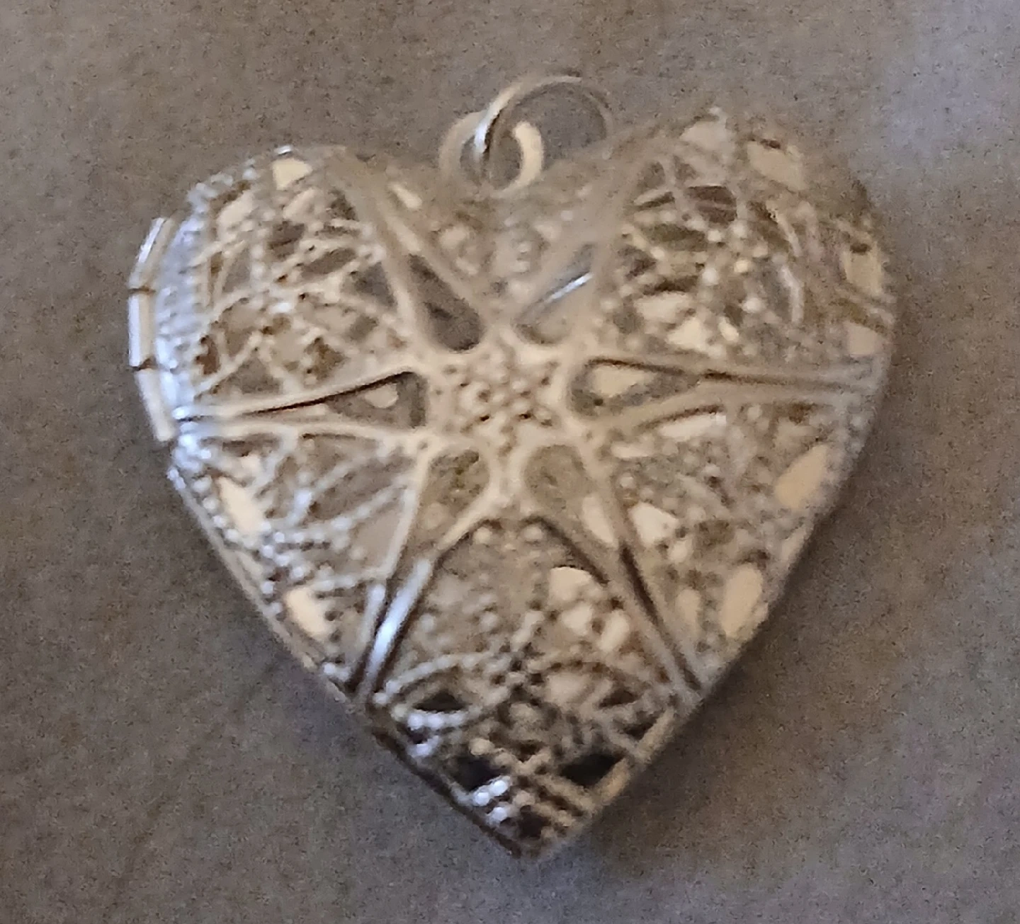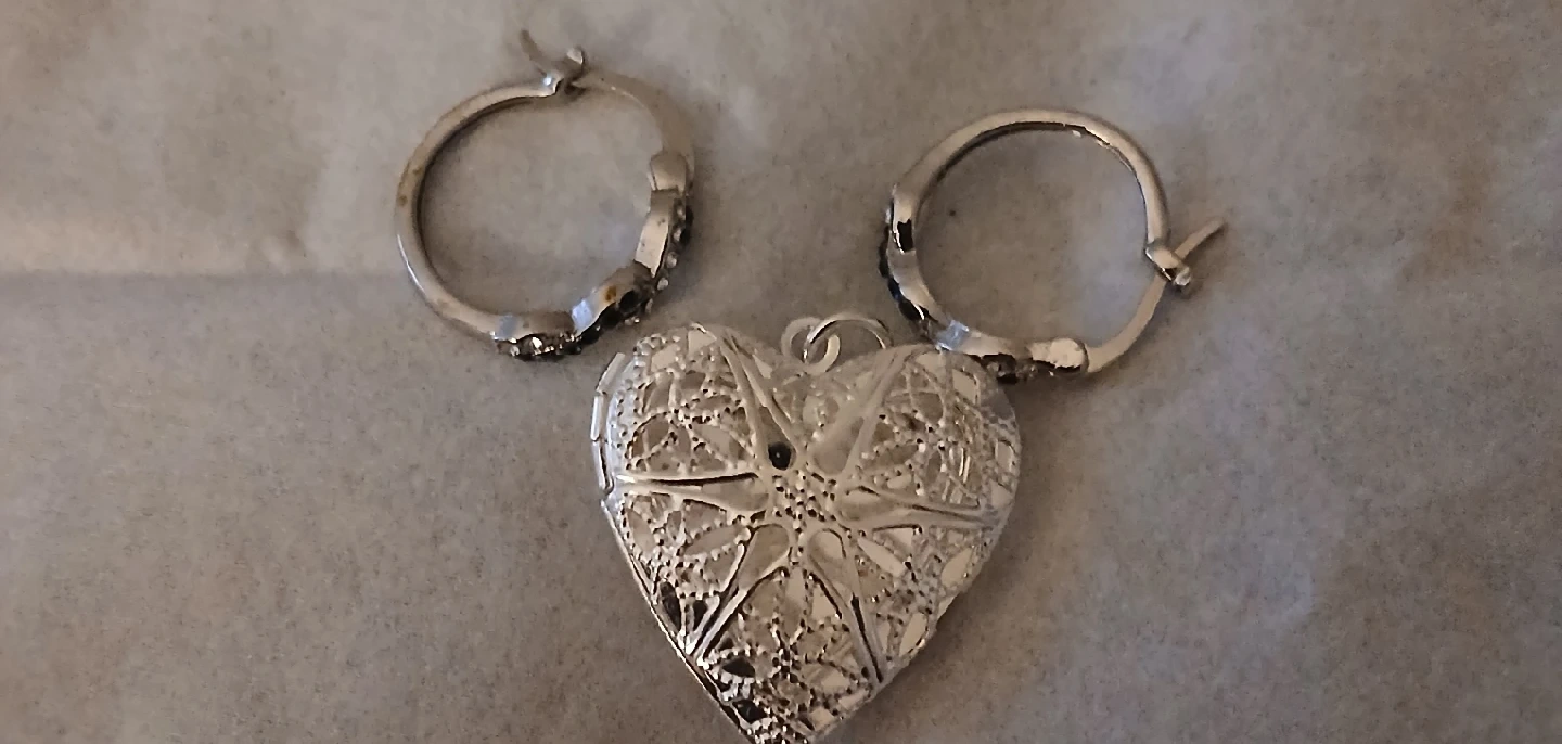 1000+Selling a lovely silver heart locket and a pair of hoop earrings. The locket has a beautiful filigree design and opens up. The earrings are simple and elegant, perfect for everyday wear. They're in great condition and ready for a new home!
