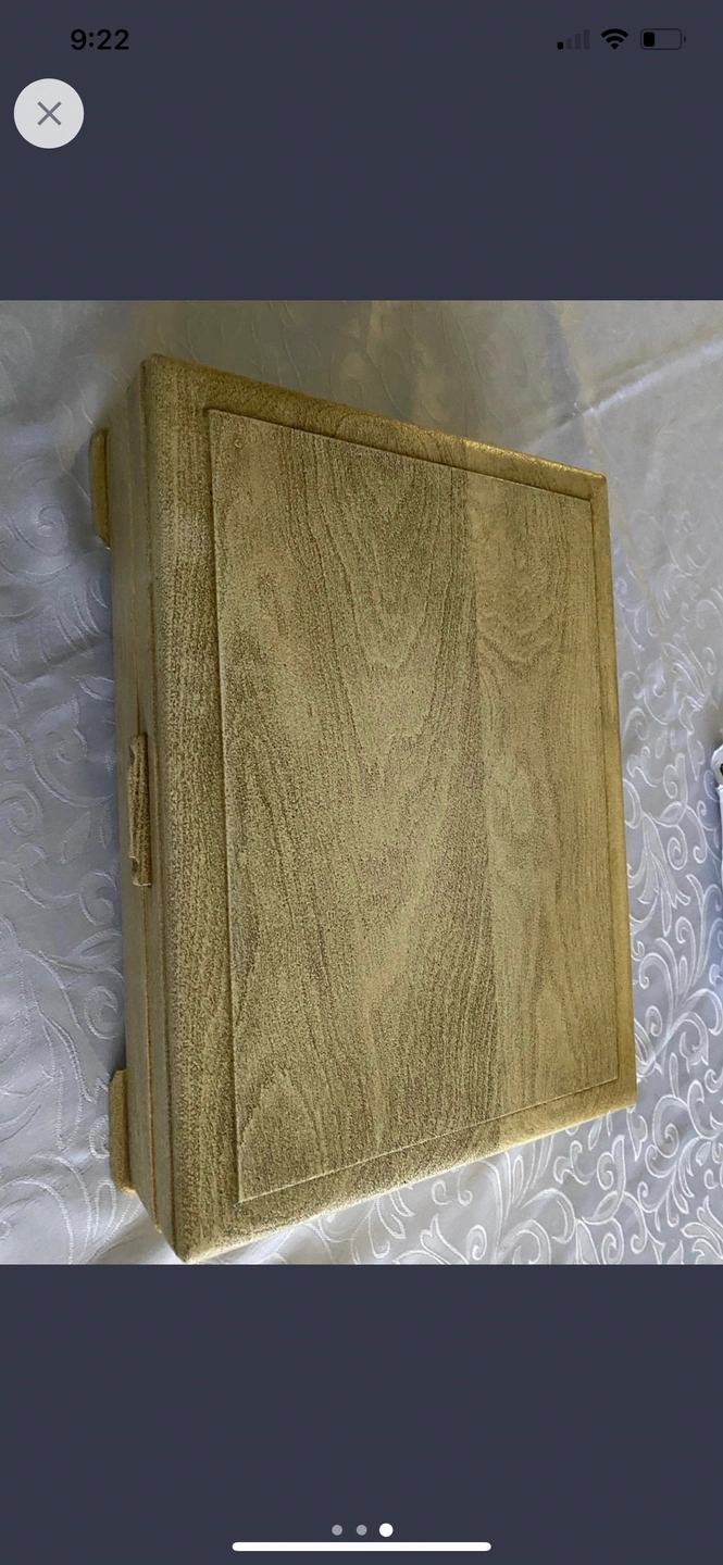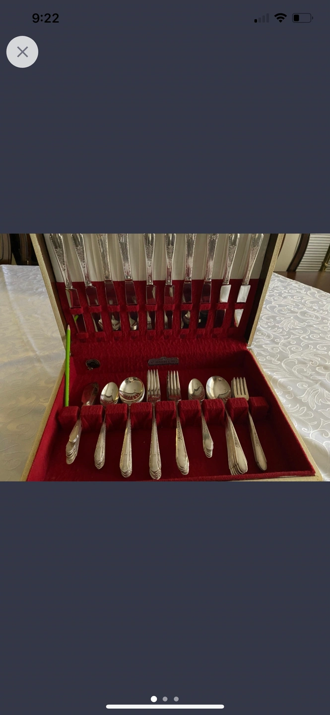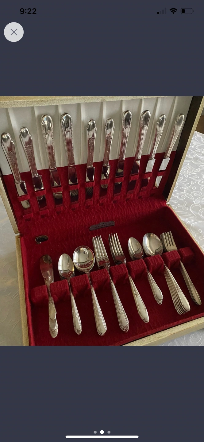 124Set of silverware in a wooden case. The case is lined with red velvet. This set includes knives, forks, and spoons. There are about 60pieces in total. The case has a few minor scratches and the silverware may have some tarnish.